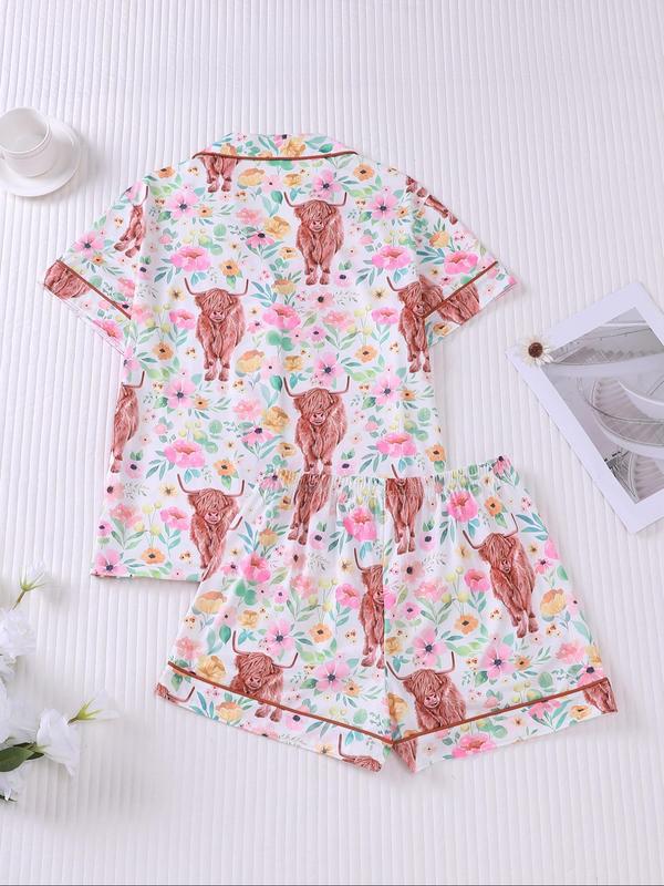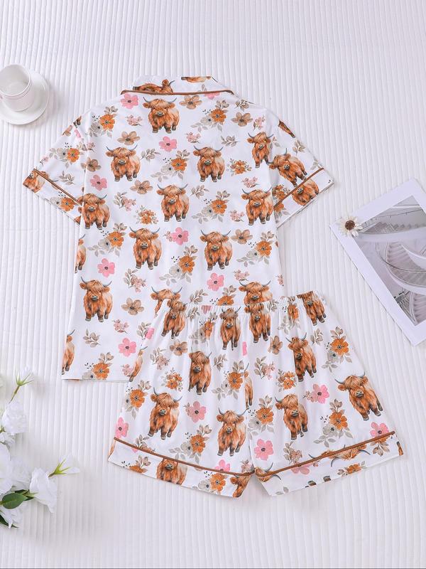 Women's All Over Print Pajama Two-piece Set, Casual Comfy Short Sleeve Top & Elastic Waist Shorts Loungewear Set, Ladies Summer Sleepwear