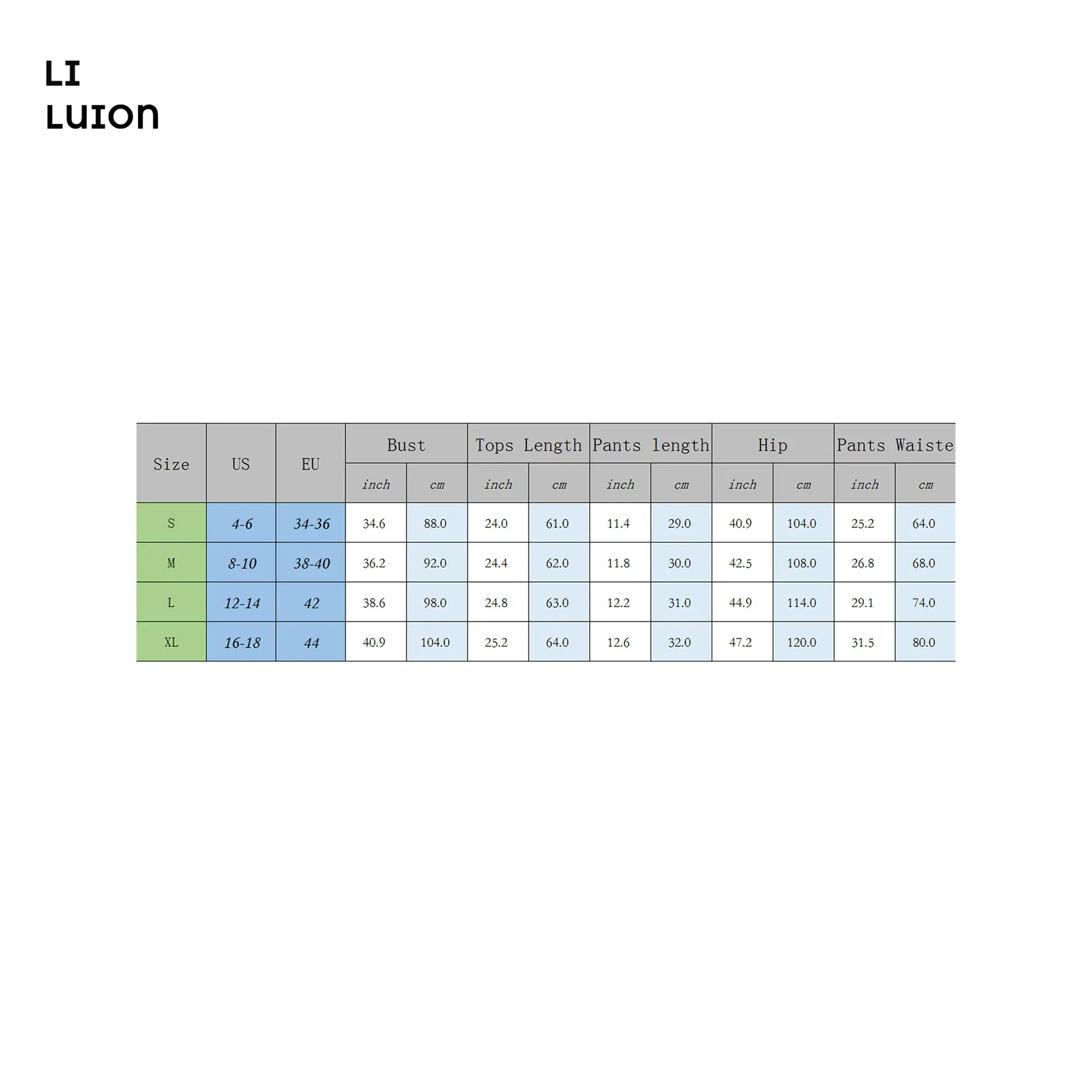 L Tops Length: 24.8 Bust: 38.58 Pants Length: 12.99 Waist: 29.13 Hip: 44.88