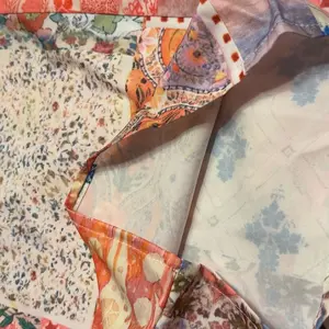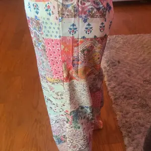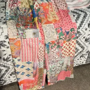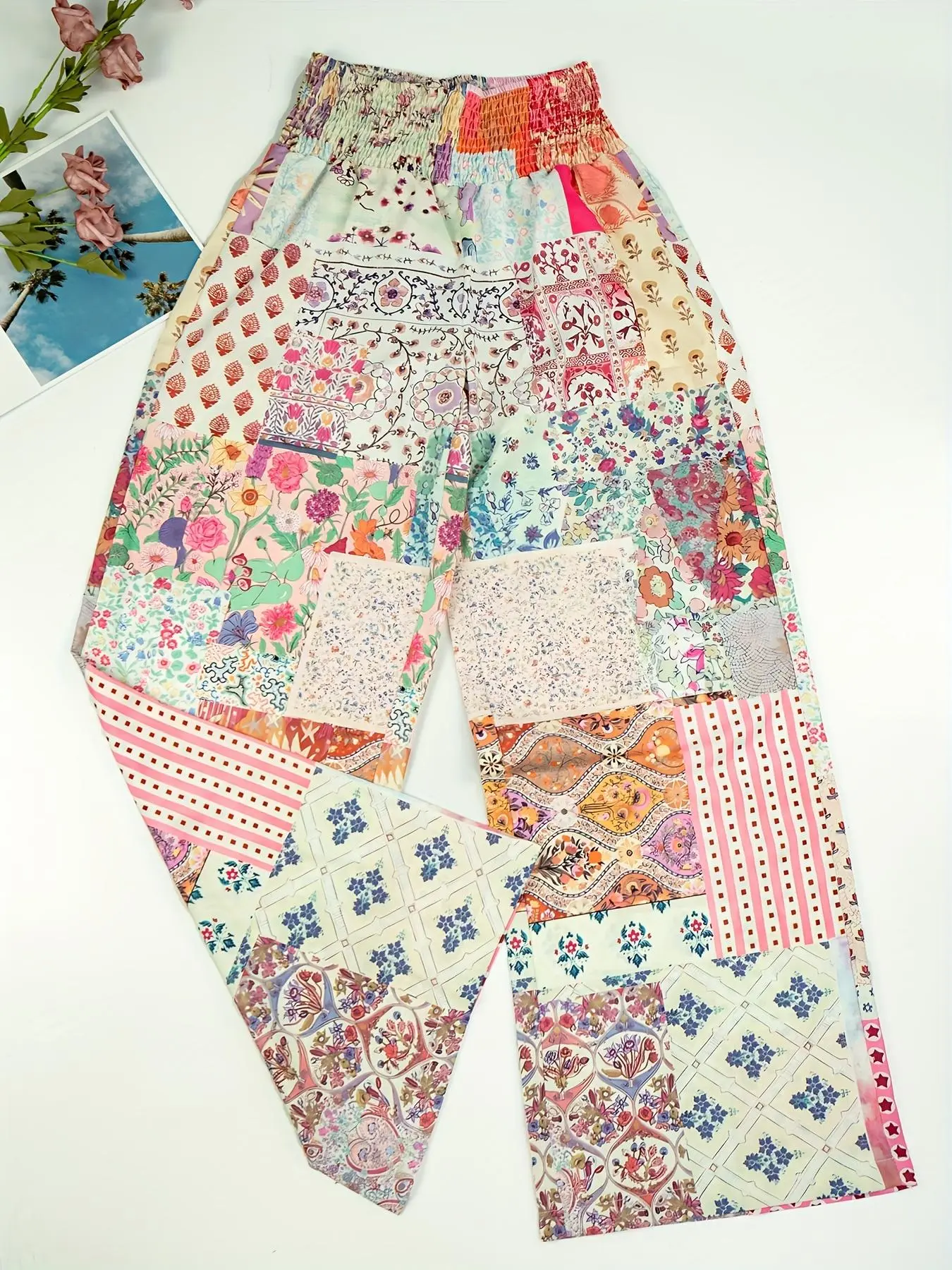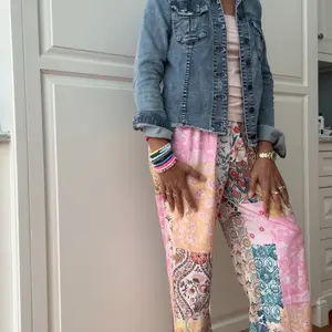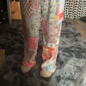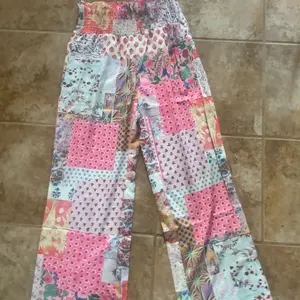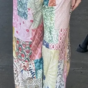 These pants are so cute and comfortable! I love them! The elastic waist makes for a perfect fit, and the nice flowing fabric gives us soft and fits well. The patchwork pattern is very trendy now too