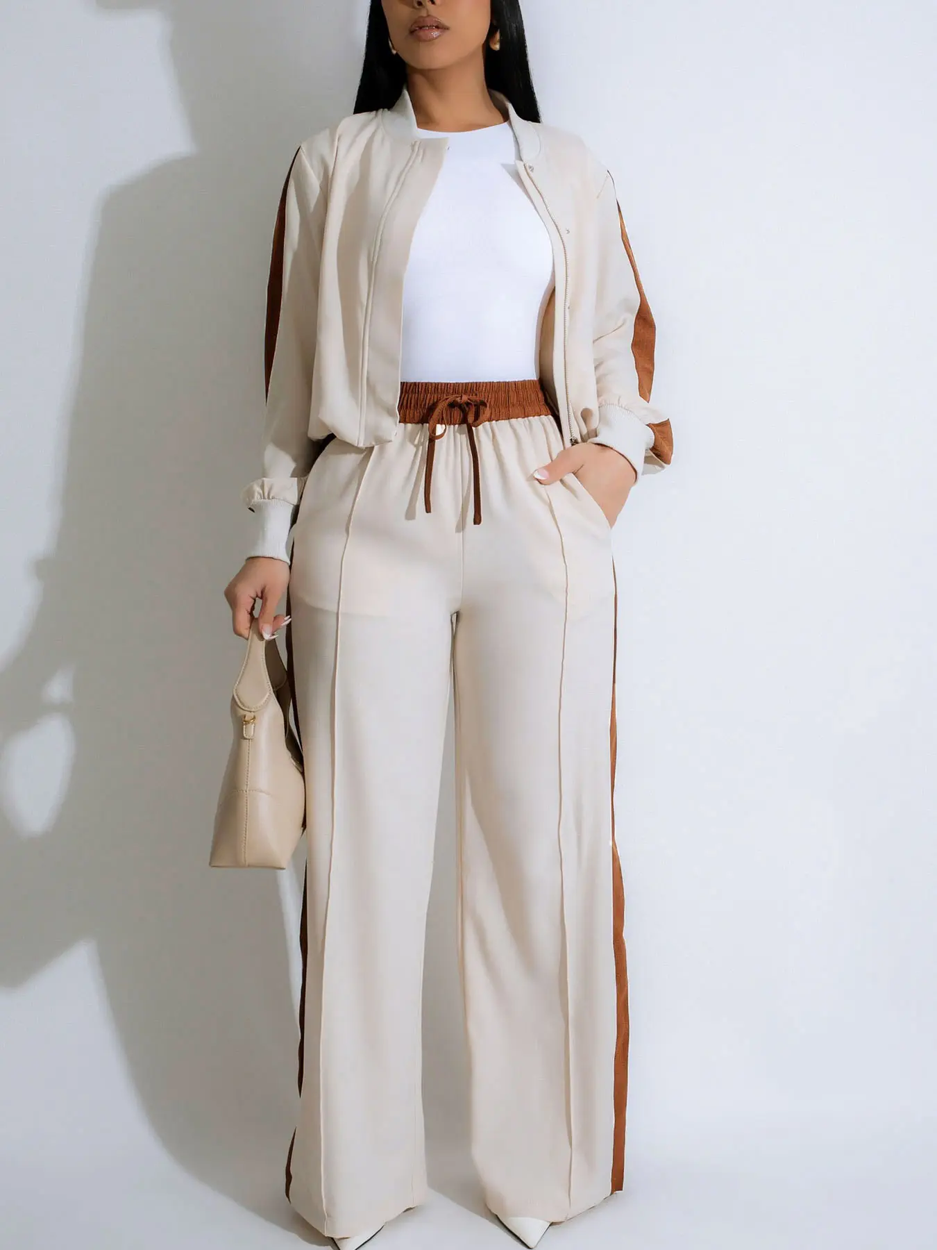 Women's 2-Piece Colorblock Fitted Zipper Jacket & Wide-Leg Pants Set, Casual Streetwear, Daily Commute Fashion, Trendy Women's Clothing