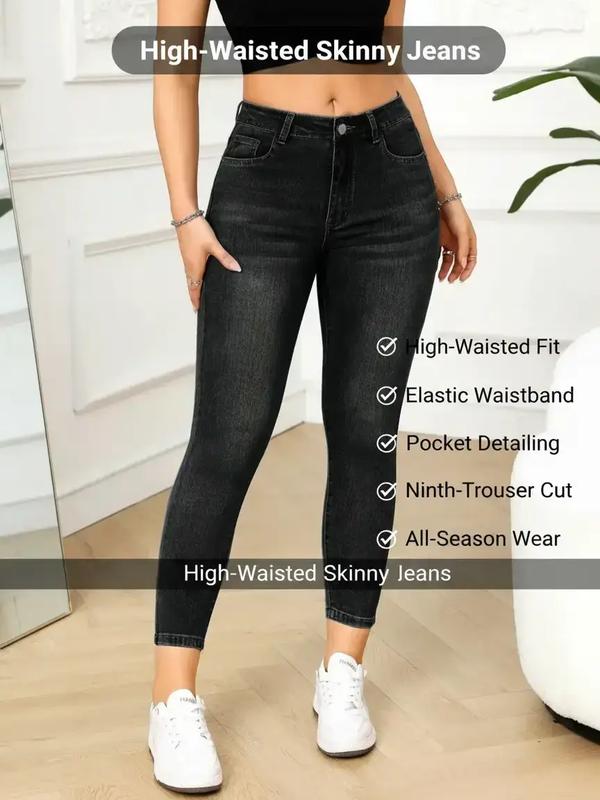 5. Women's Petite High-Waisted Elastic Belted Pocket Skinny Jeans, Casual Slim Fit Ninth-Trousers, All-Season Wear, Elegant Daily