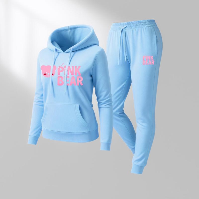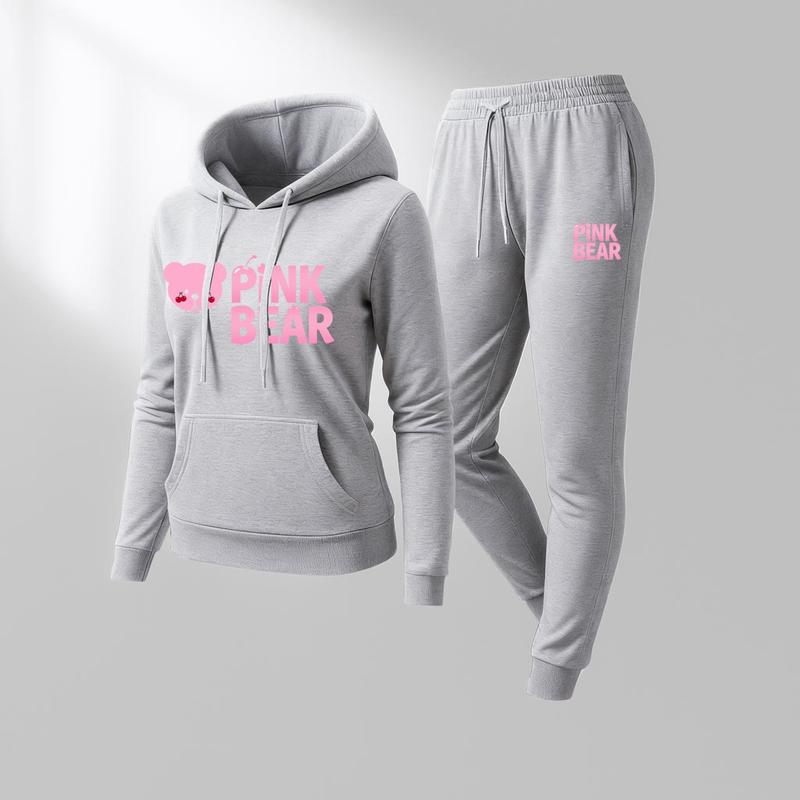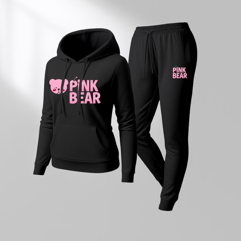 Women's Pink Bear Print Hoodie And Drawstring Track Pants Set, Casual Sportswear, Long-Sleeved Hooded Jacket And Pants, Suitable For Autumn And Winter, Everyday Wear, Indoor And Outdoor Sportswear, Sportswear Set, Casual Sportswear.
