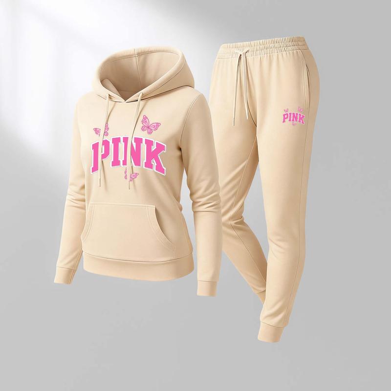 Women's Pink Butterfly Print Hoodie & Drawstring Track Pants Set