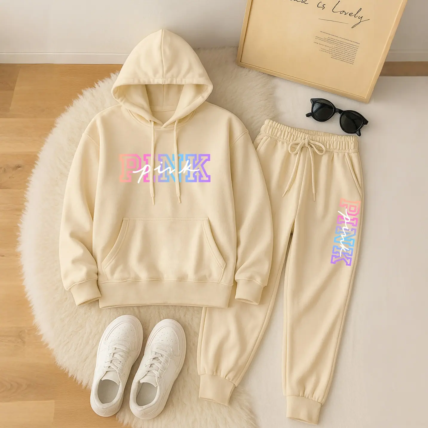 5. Women's Colorful PINK Print Hoodie And Drawstring Track Pants Set, Casual Sportswear, Long-Sleeved Hooded Jacket And Pants, Suitable For Autumn And Winter, Everyday Wear, Indoor And Outdoor Sportswear, Casual Sportswear02 SpringStatements
