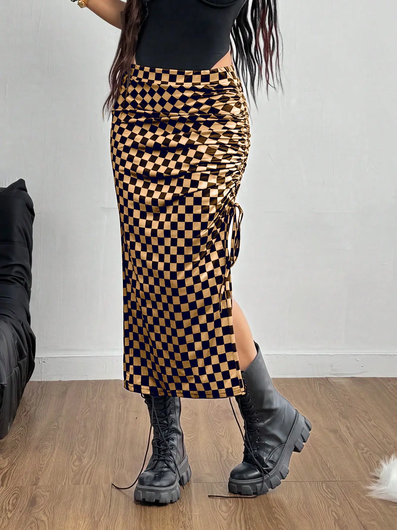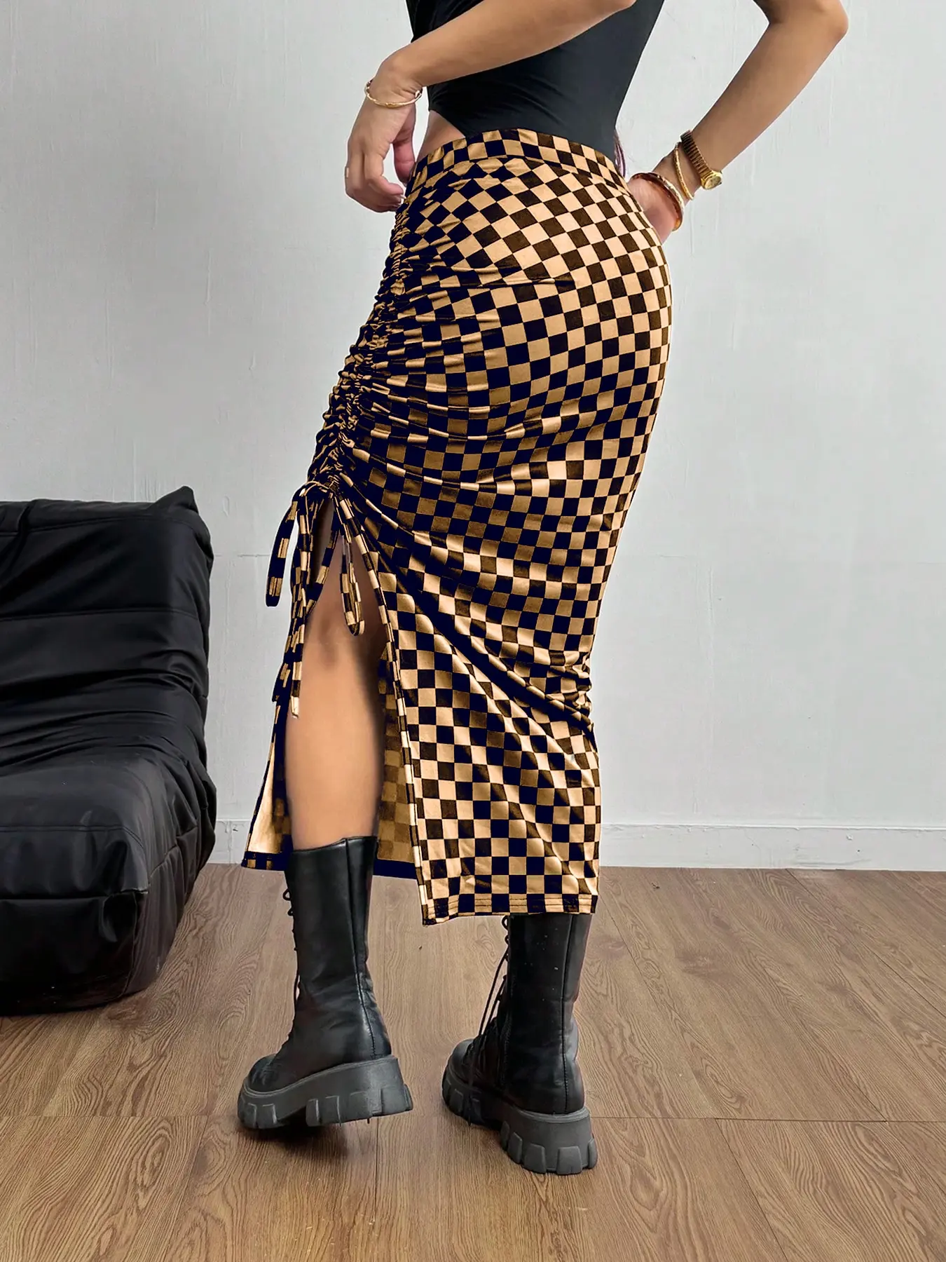 Women's Plaid Drawstring Waist Skirt, Casual Sporty Split Design, Slim Fit Half-Length Skirt for Daily Wear & Outdoor Activities #skirt #skirts #maxiskirt #skirtoutfit #valentinesoutfitinspo #skimsfoldoverpants #longskirtoutfit #cuteskirts #jeanskirts #valentinesactiveoutfit