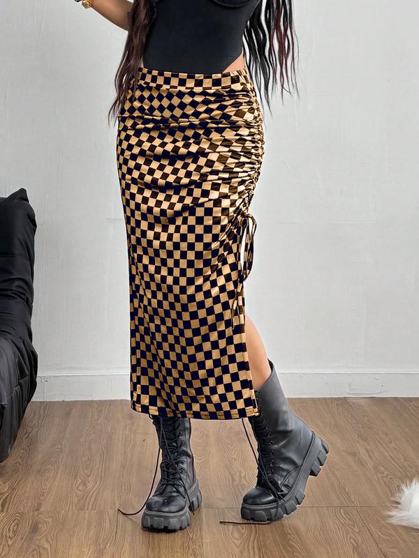 5. Valentine's Day Women's Plaid Drawstring Waist Skirt, Casual Sporty Split Design, Slim Fit Half-Length Skirt for Daily Wear & Outdoor Activities