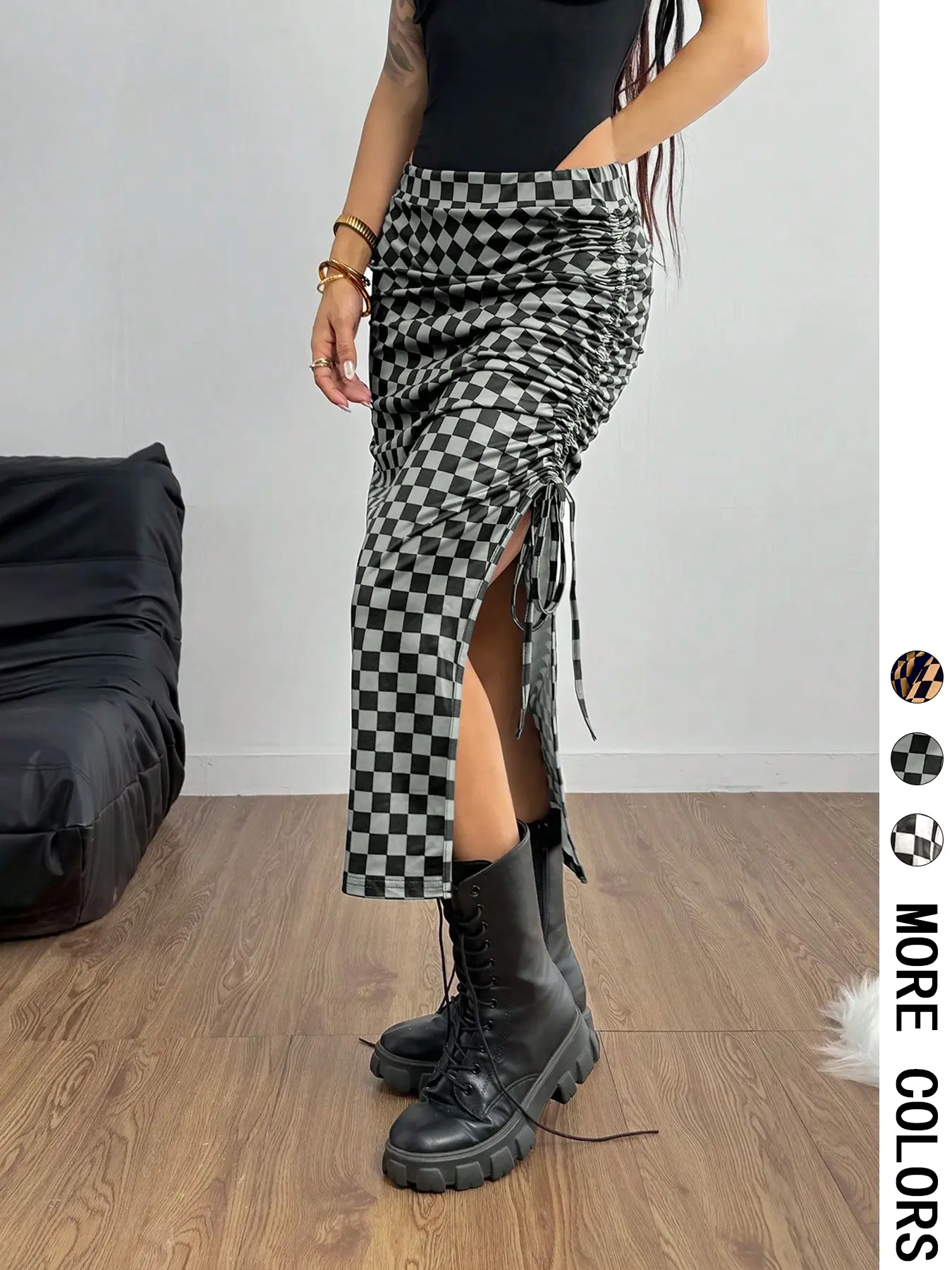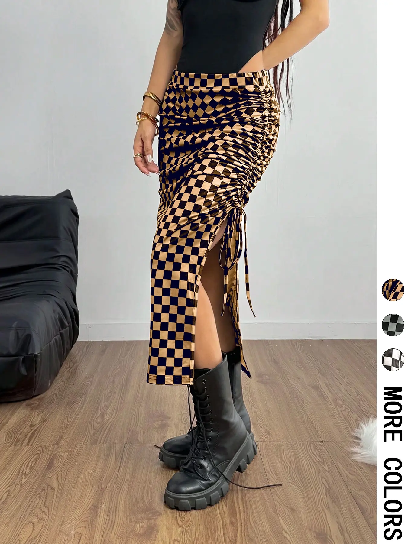Women's Plaid Drawstring Waist Skirt, Casual Sporty Split Design, Slim Fit Half-Length Skirt for Daily Wear & Outdoor Activities #skirt #skirts #maxiskirt #plussizestyleinspo #skirtoutfit #valentinesoutfitinspo #skimsfoldoverpants #longskirtoutfit #cuteskirts #jeanskirts