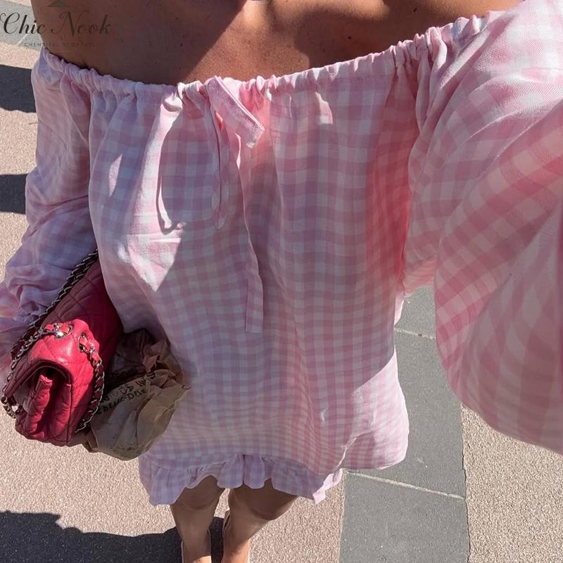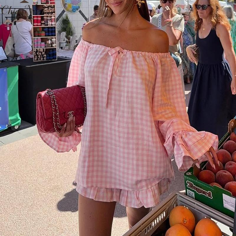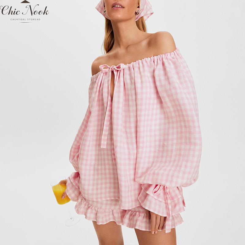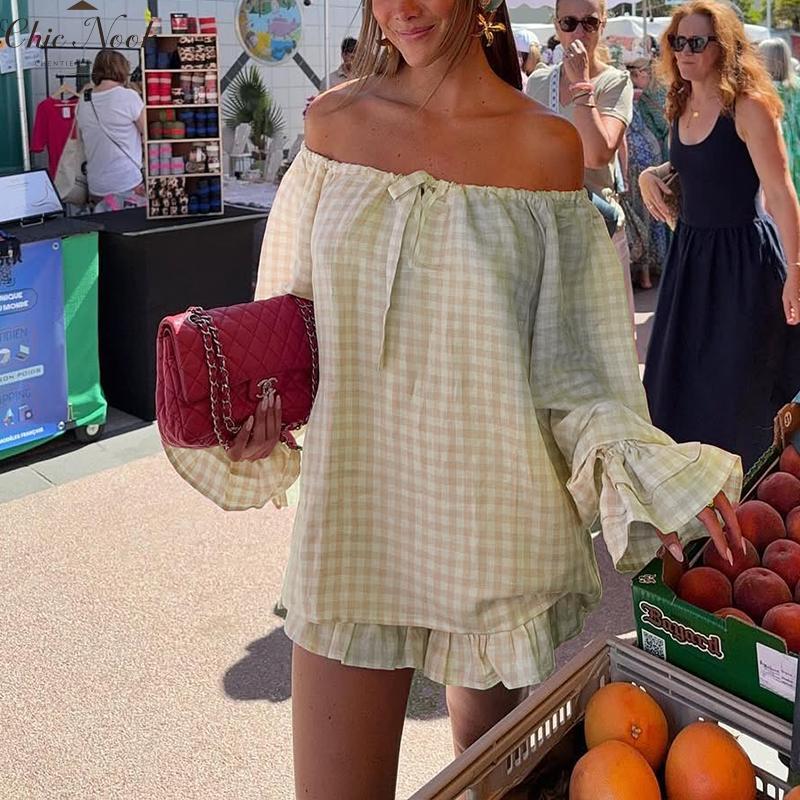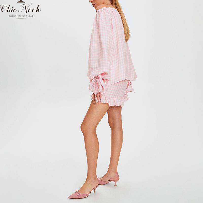 Women Fashion Plaid Outfit, Long Sleeve Tie-up Crew Neck T-shirt And Elastic Waist Shorts Summer OutfitWomen Fashion Plaid Outfit, Long Sleeve Tie-up Crew Neck T-shirt And Elastic Waist Shorts Summer Outfit