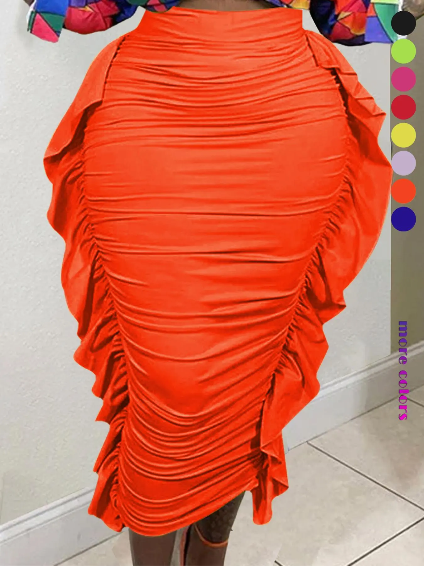 Women's Plain Ruched Ruffle Trim Bodycon Skirt, Casual Fashion High Waist Midi Skirt for Daily Outdoor Wear, Women's Bottoms for Spring & Fall