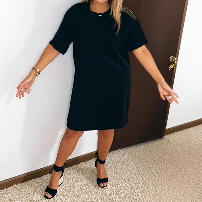 Fabric is more like a tshirt. And very light. But it fits really nice. Super comfortable and still classy. It was the only outfit I wore twice on my last trip. Ordering another color now.