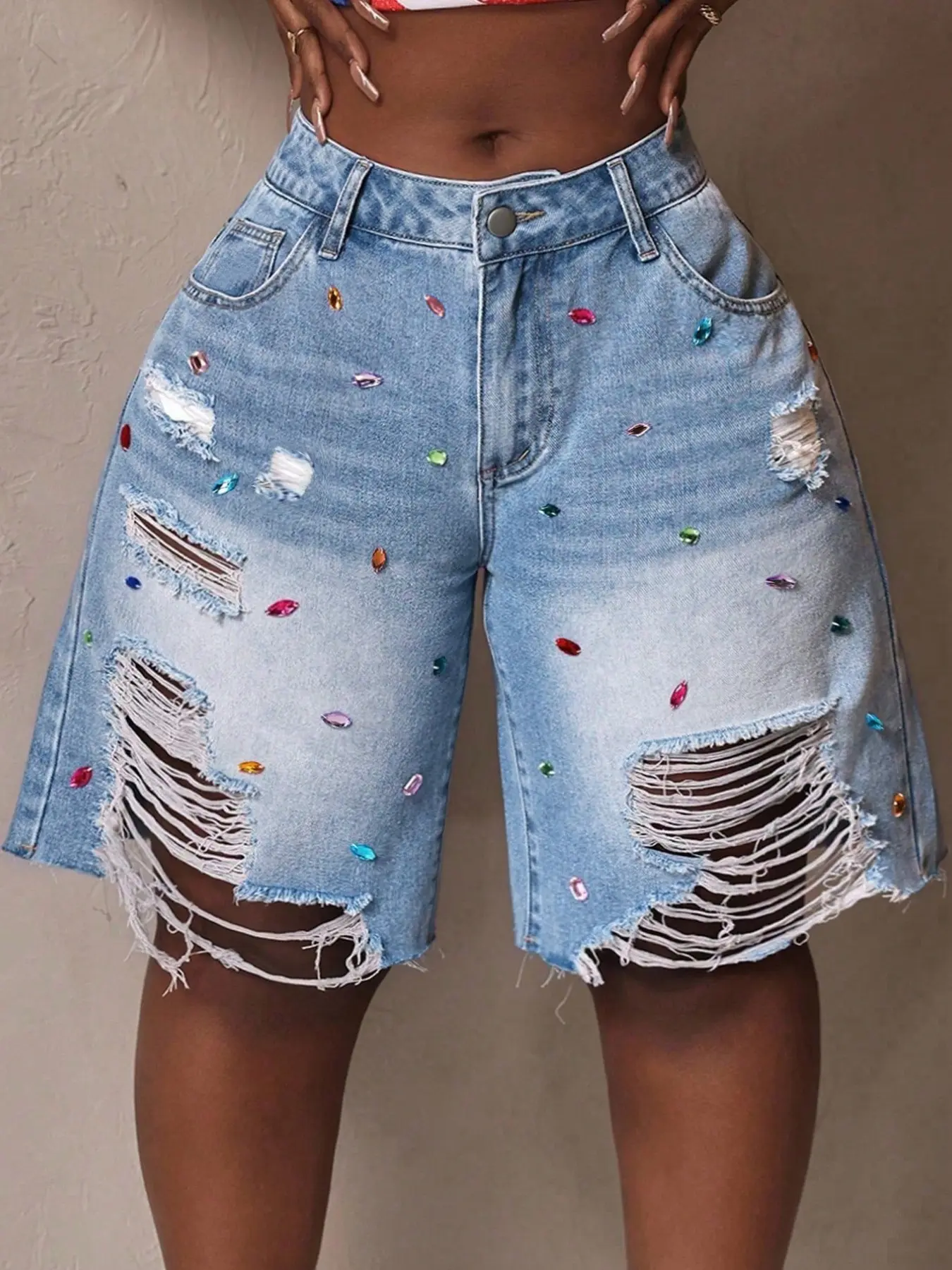 【Ripped Accents】: Featuring a trendy ripped design, these denim shorts add a modern twist to your spring and summer wardrobe.