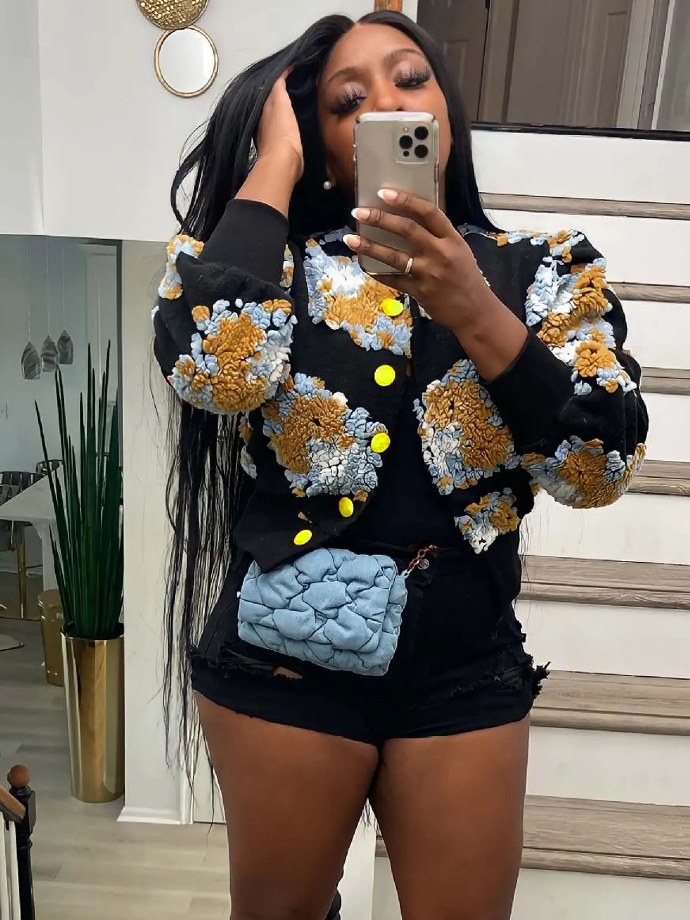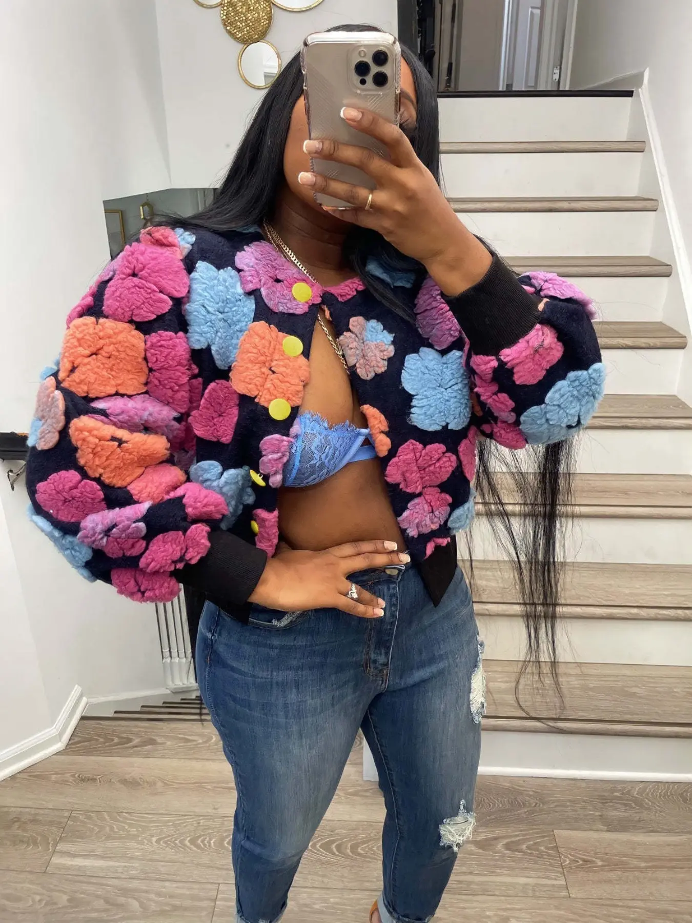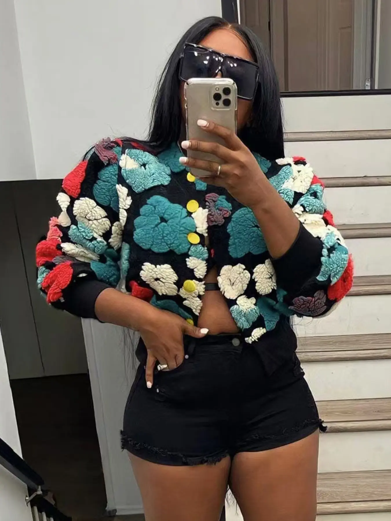 Absolutely LOVE this jacket! It's so uniquely cute! I'm gonna rock it with a cute turtleneck when the weather permits, jeans and boots! Would even look cute over a sexy sweater dress! Fits well! I'm 5'7, 220ilbs. Got a size 1xl. Sleeves are roomy and not short! Copped and not too tight. ❤️