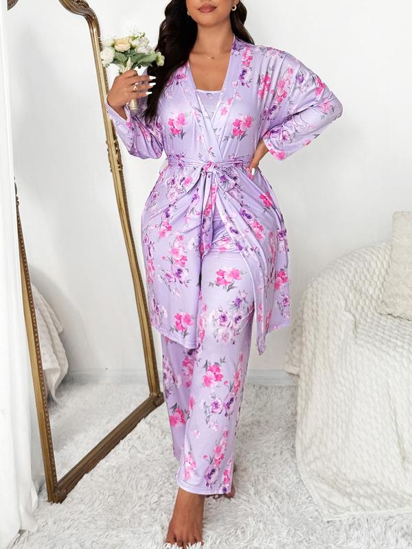 【Plus Size】 Floral Print Lounge Robe & Cami Top & Pants Pyjama Set, Casual Comfy Loungewear Set for Women, Women's Sleepwear for Spring & Fall, Soft Pajamas