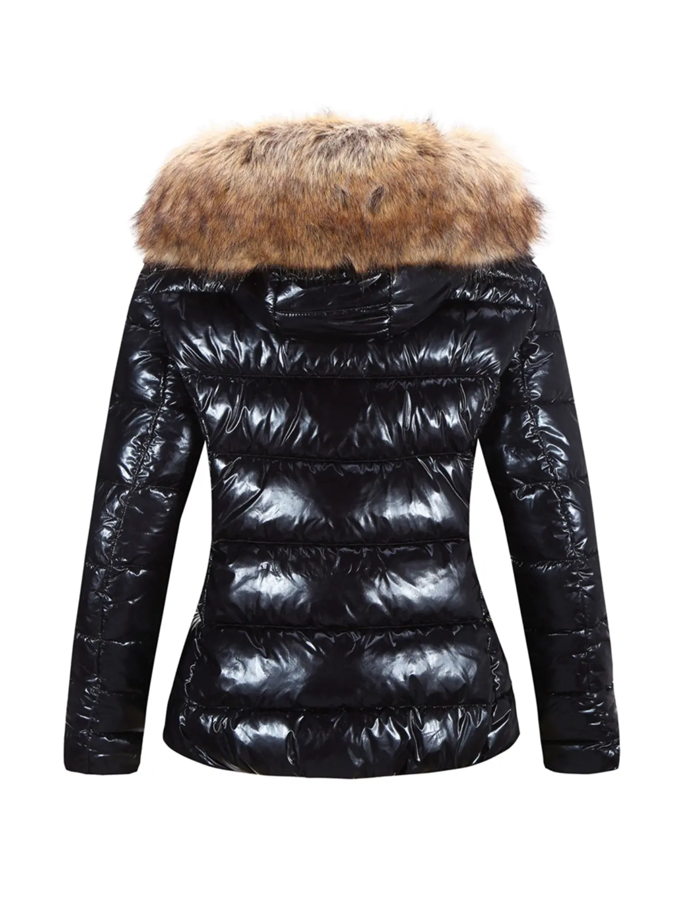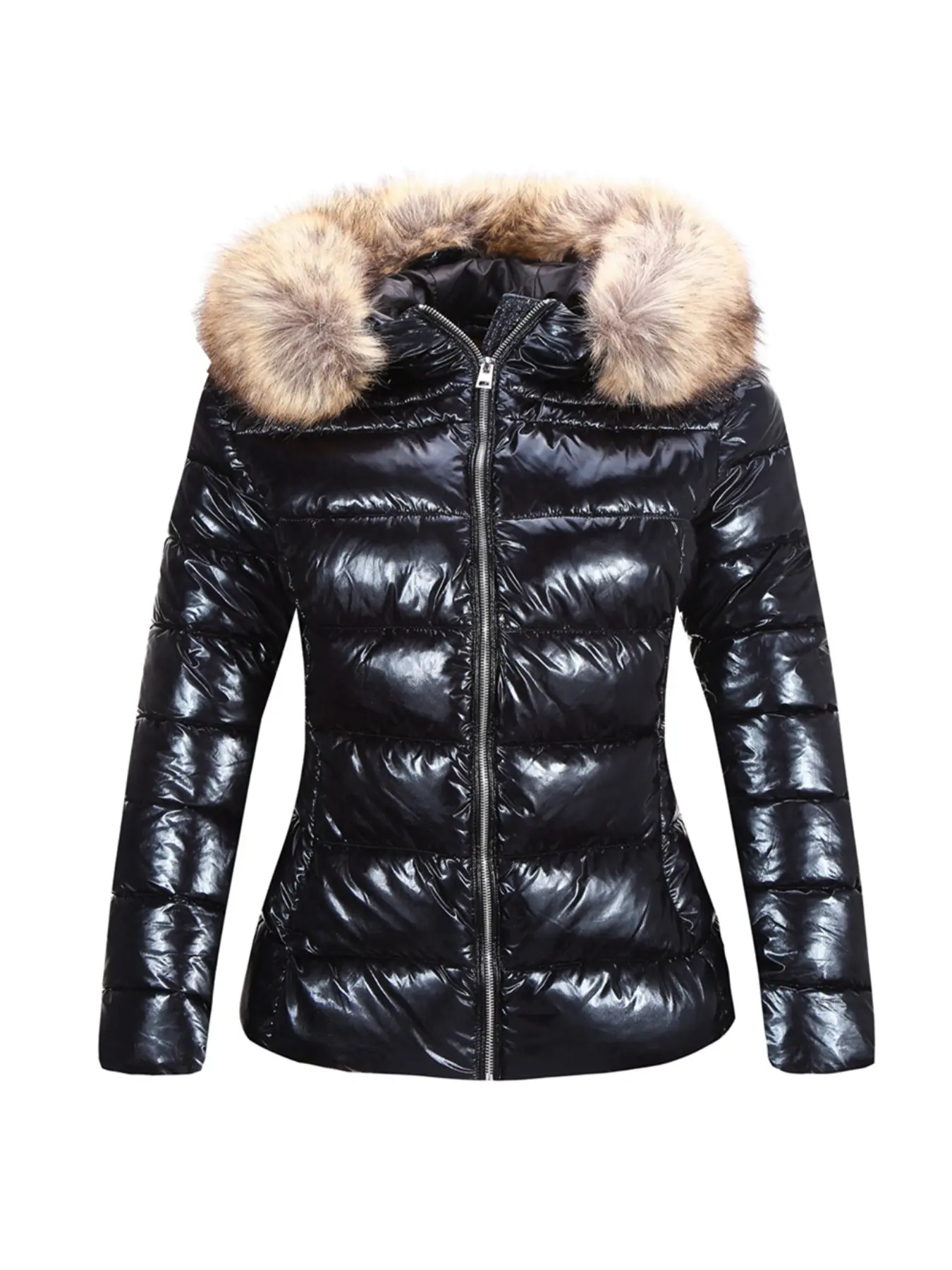5. Women's Plus Size Hooded Puffer Jacket, Warm Street Style Fitted Coat with Faux Fur Collar, Hidden Zipper, Pockets, Fall & Winter Fashion