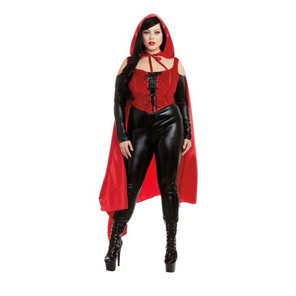 Whether you are running to Granny’s or just out for some drinks, you will love the way you look and feel in this Women's Plus Size Seductive Red Costume. The jumpsuit is both cute and flattering, with plenty of characteristic style. The attached corset is a deep red to match the cape, but it also has some great black ribbon lacing to tie in the other colors of the costume. The ribbon ties are also very stylish and add some great flair to the costume. From head to toe, you will look just as great as you feel.