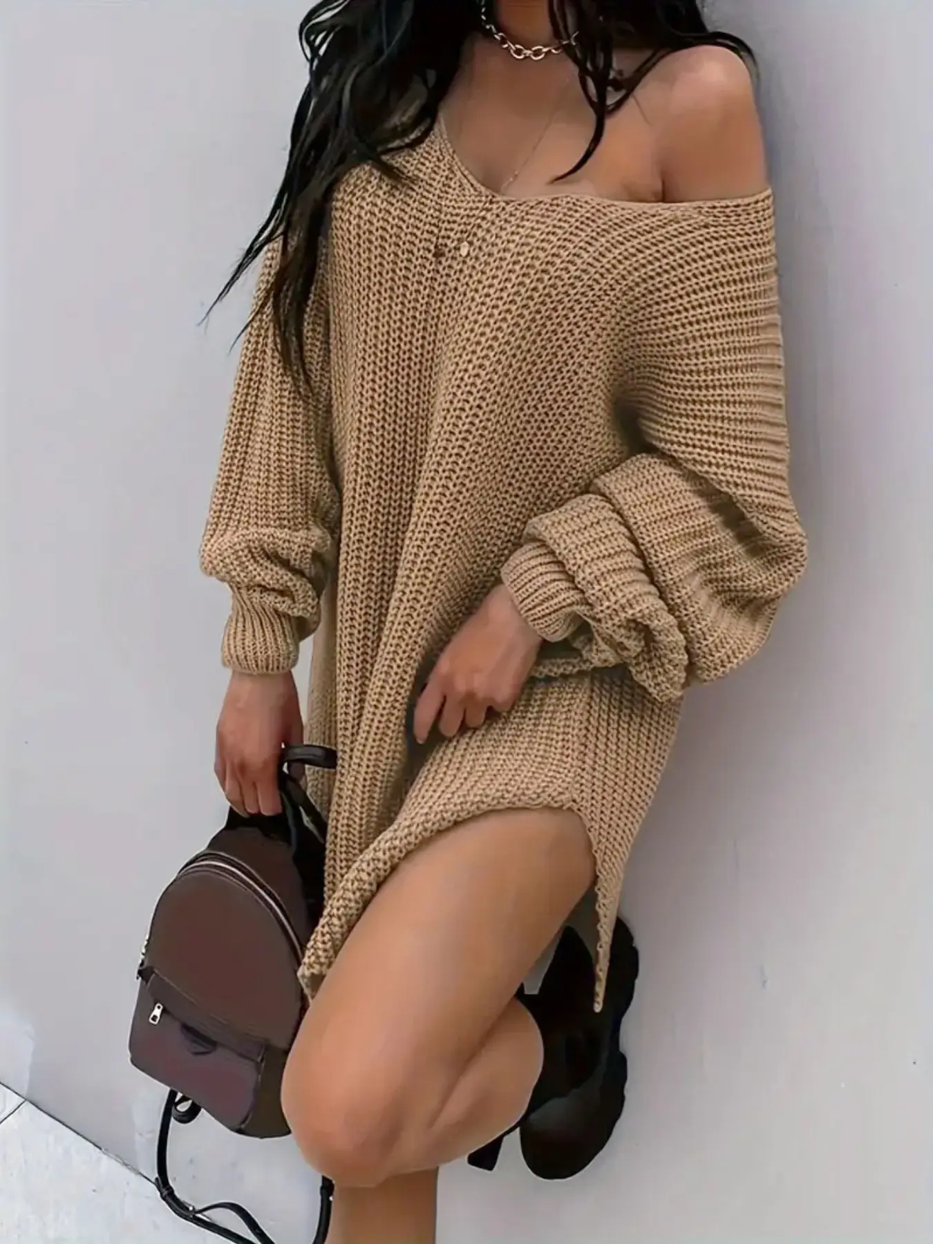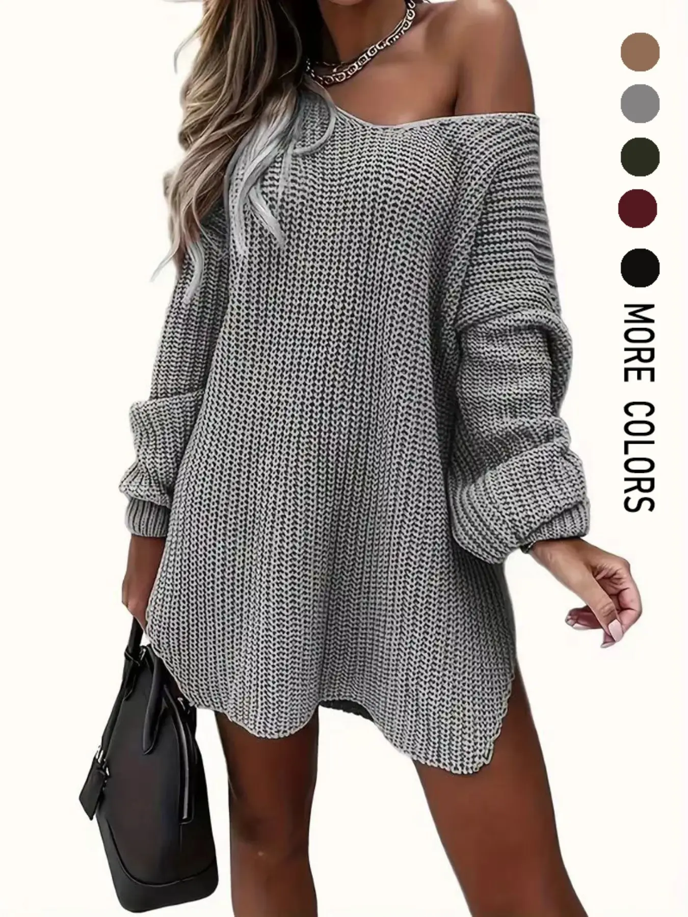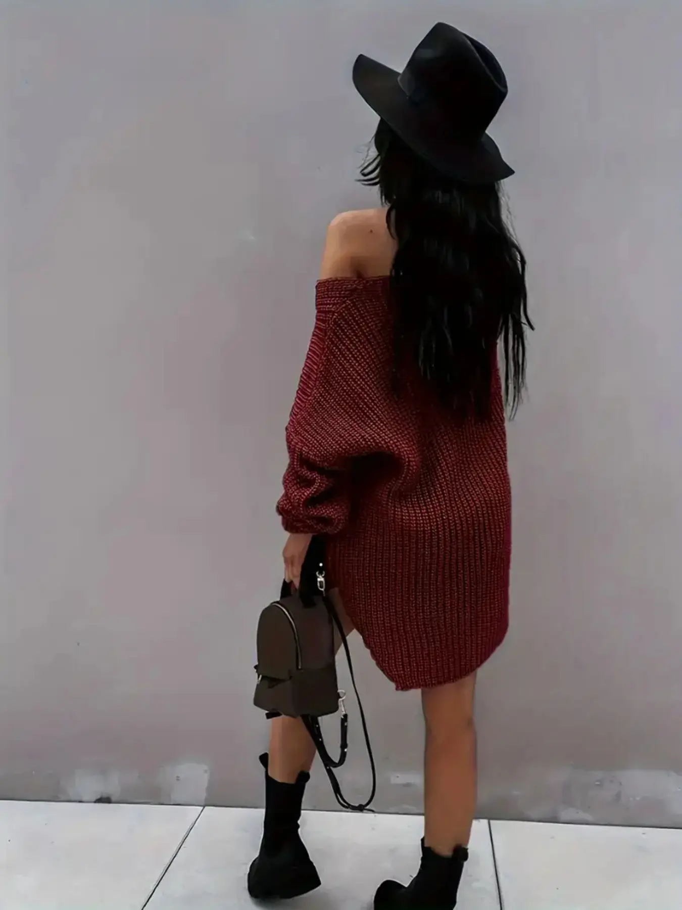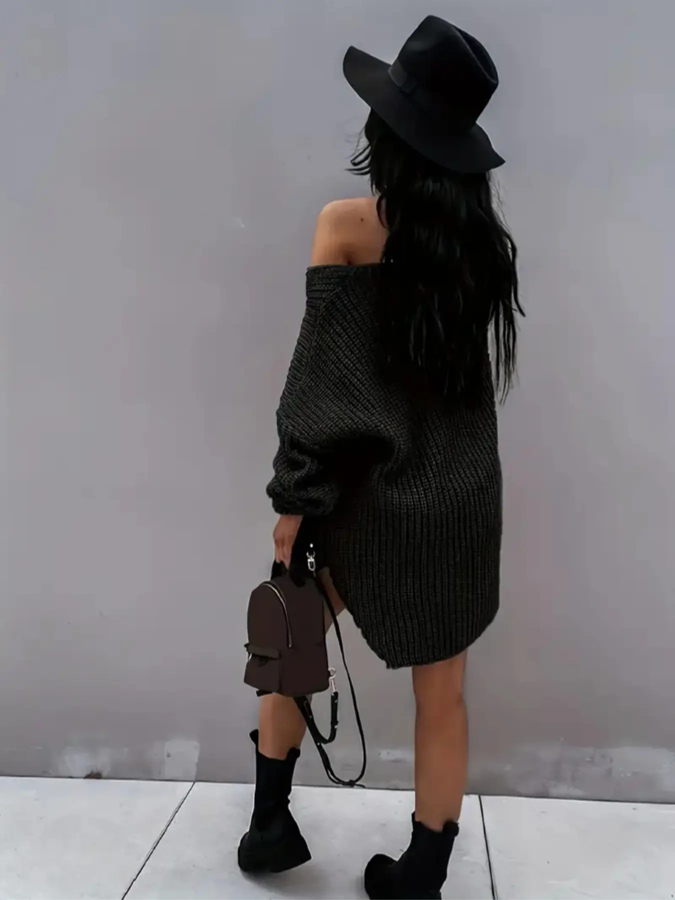 Get you this dress! You can wear it as a dress or top and you can style it up or down. It’s a knit sweater material that is not itchy at all and it’s super comfortable! I sized up for a more looser fit.