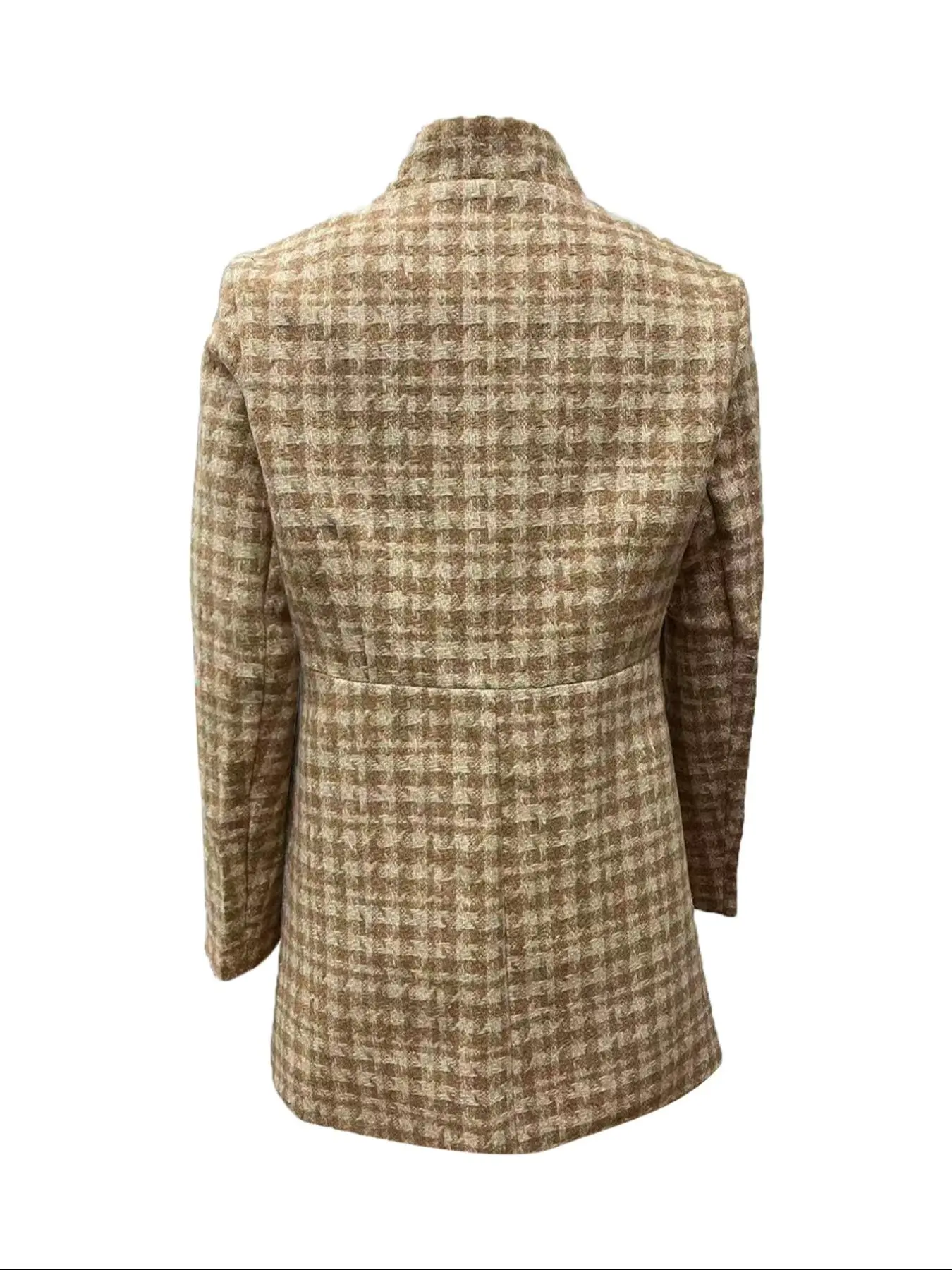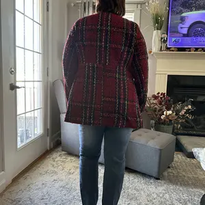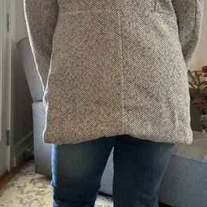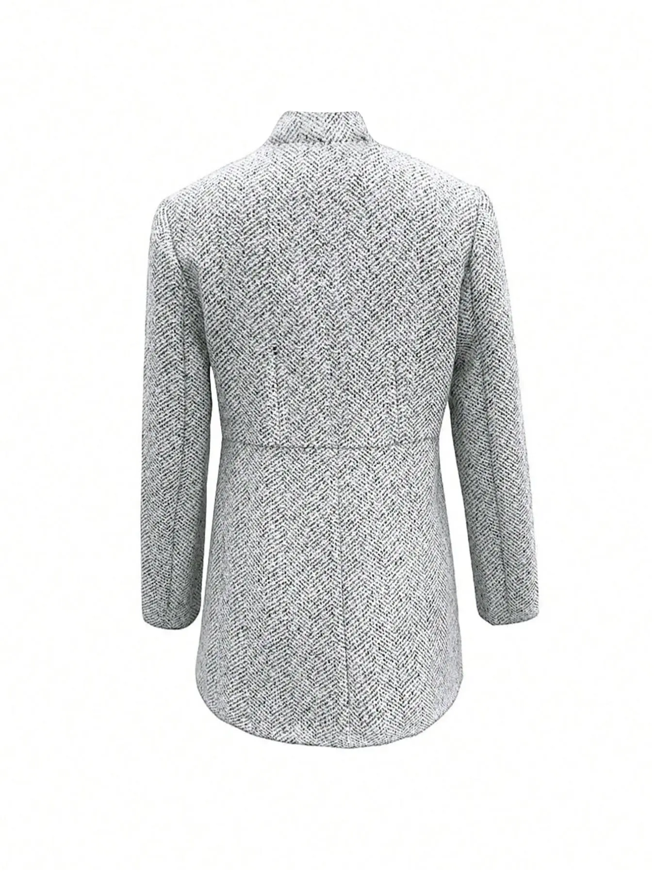 This is a women's coat featuring a herringbone pattern in a mix of light gray and black tones, giving it a textured and classic look. It has a relaxed fit, long sleeves, and a stand-up collar. The coat is open-front styled and includes side pockets, adding both functionality and a casual vibe. #plushjackets #prettygardensweatsuit #winterpajamasset #fashionablewomensclothing #womensskicoat #womensweartrend #cozywearableblanket #autumnandwintercoat #plussizefallstyle #jeanhoodie #women's #coat