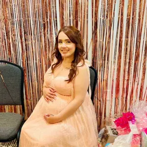 I bought this for my baby shower in two weeks and it is GORGEOUS!! I’m 5’8 and currently 157lbs. I’ll be 28 weeks at my shower and the medium fits perfect! (If I was more than 32 weeks I probably would have needed a large) but I wanted to be able to rewear it after the shower!