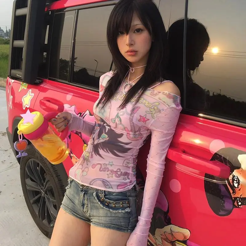 2000s Japanese Y2k Anime Print Mesh Tops 2000s Aesthetics Pink Sheer Top Vintage See Through T-shirt Lolita Womenswear Tshirt