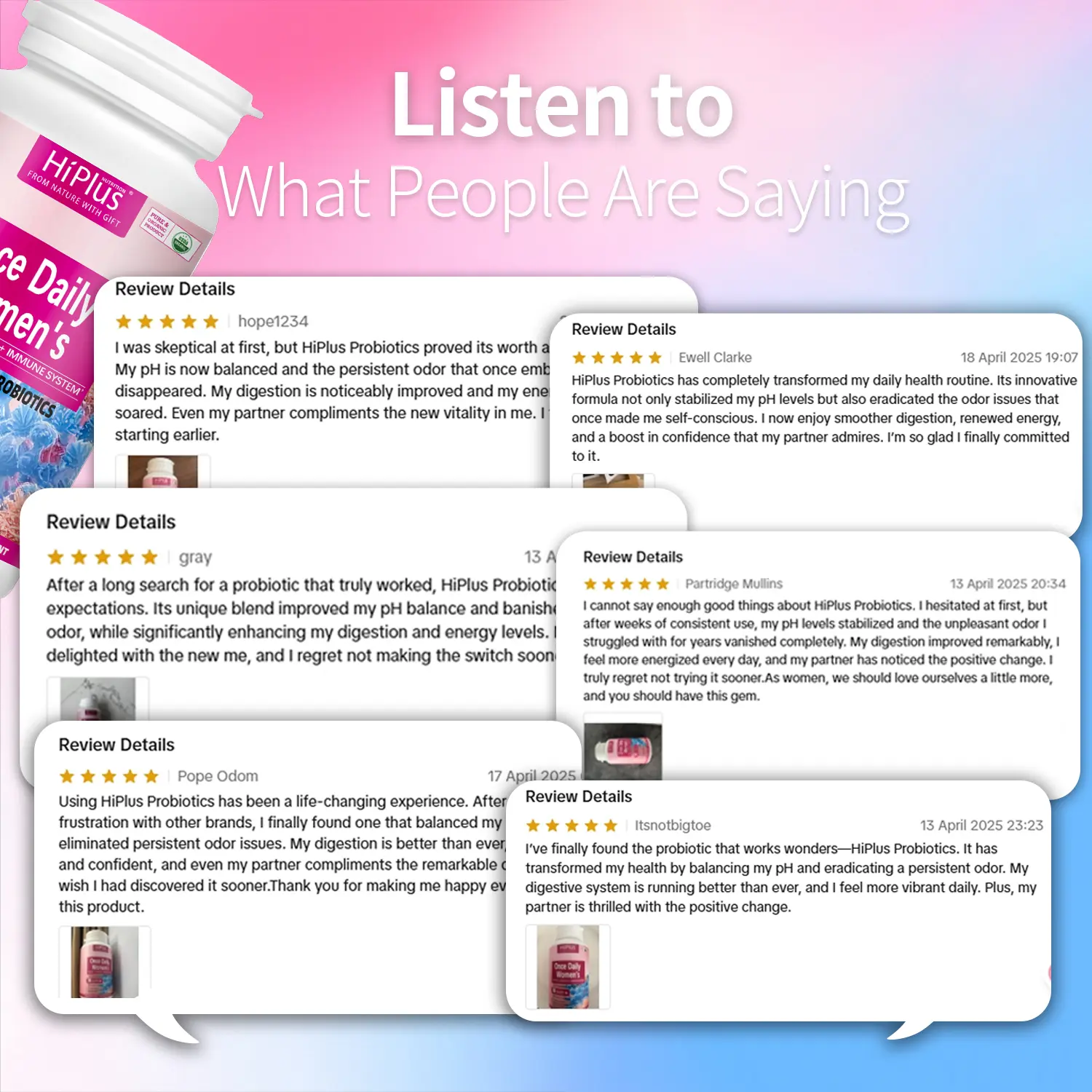 I cannot say enough good things about HiPlus Probiotics. I hesitated at first, but after weeks of consistent use, my pH levels stabilized and the unpleasant odor I struggled with for years vanished completely. My digestion improved remarkably, I feel more energized every day, and my partner has noticed the positive change. I truly regret not trying it sooner.As women, we should love ourselves a little more, and you should have this gem.