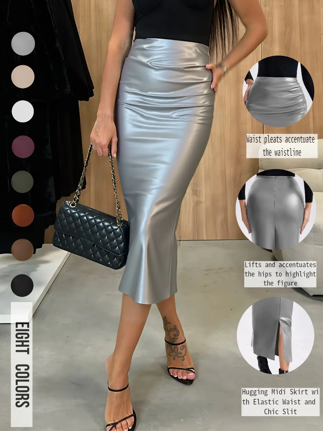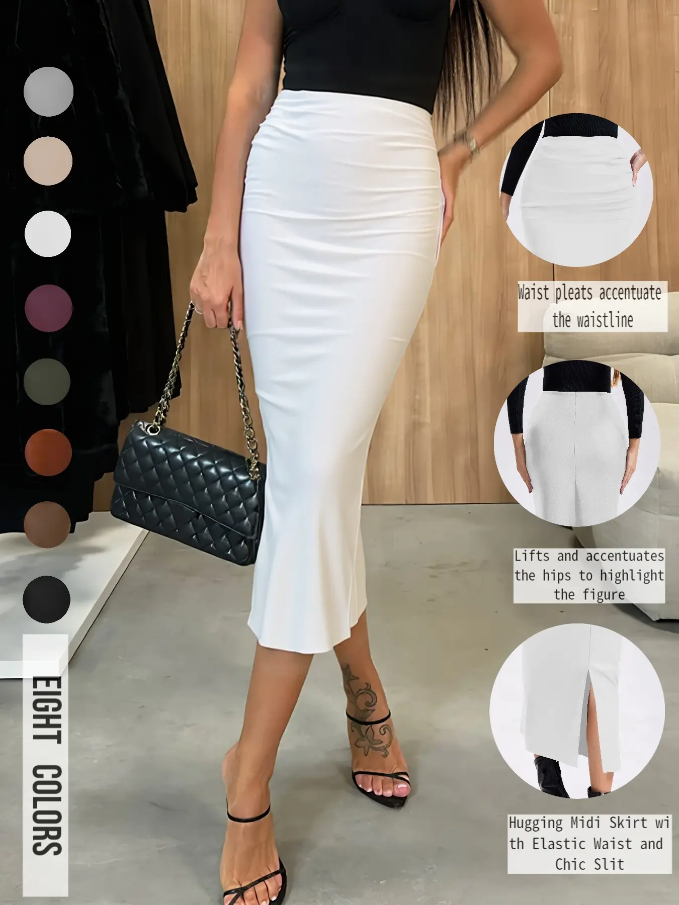 Just like the pic. I love it, I got brown (this one) & black,in size Medium. I usually get a size Large,but it’s stretchy & it fits perfectly snug. The material is smooth,not too thin,& really stretchy. Plain,but sexy design.I’m 5’1”, 138 lbs. If I wear this skirt at my waist, it fits to my ankles.