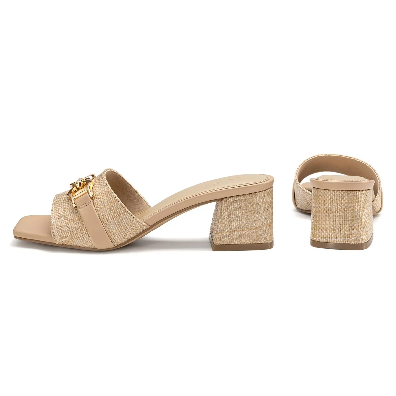 ·Fashion Styles: Choose between a textured raffia upper or smooth PU finish, each styled with an elegant metal chain accent for a polished, sophisticated look that elevates heeled sandals for women