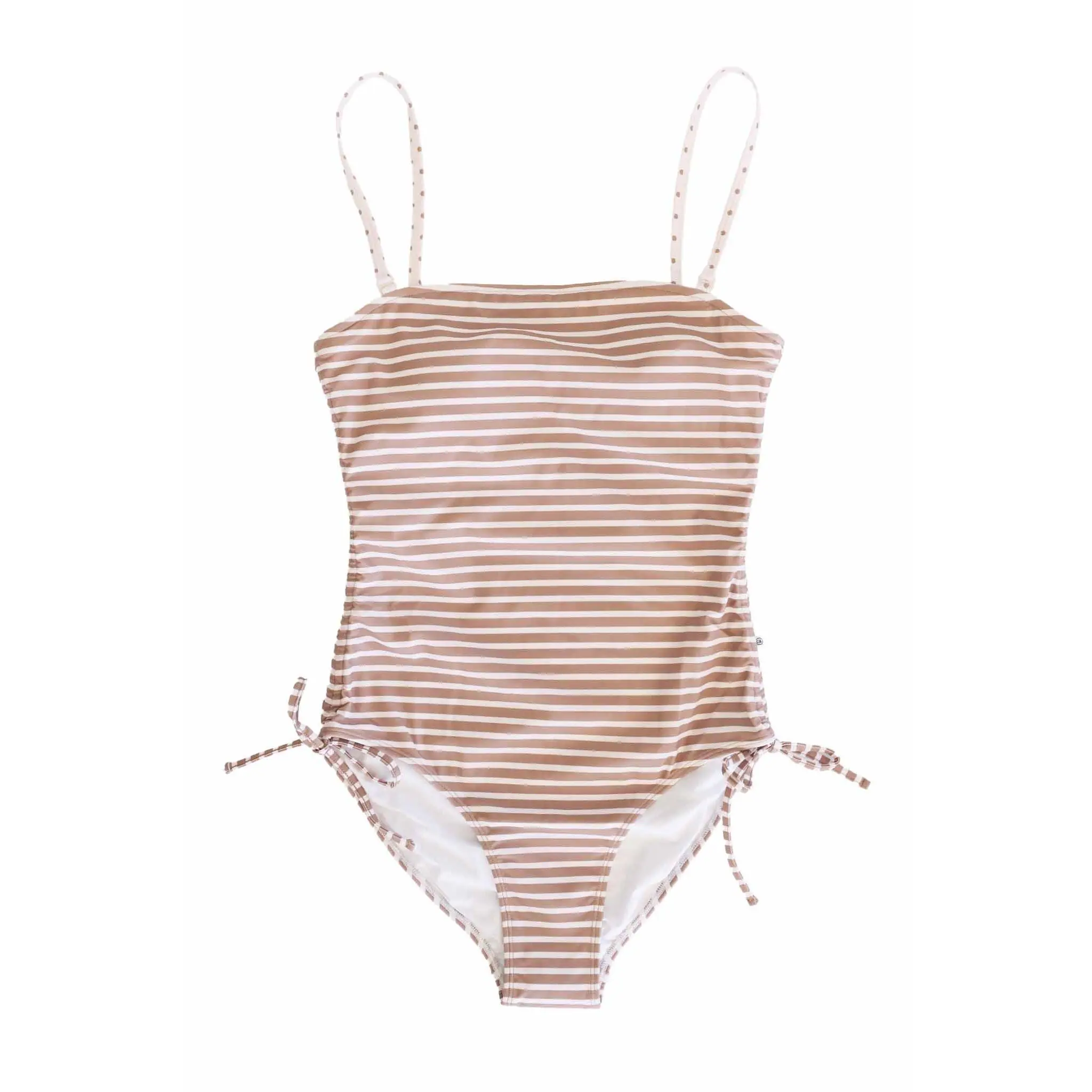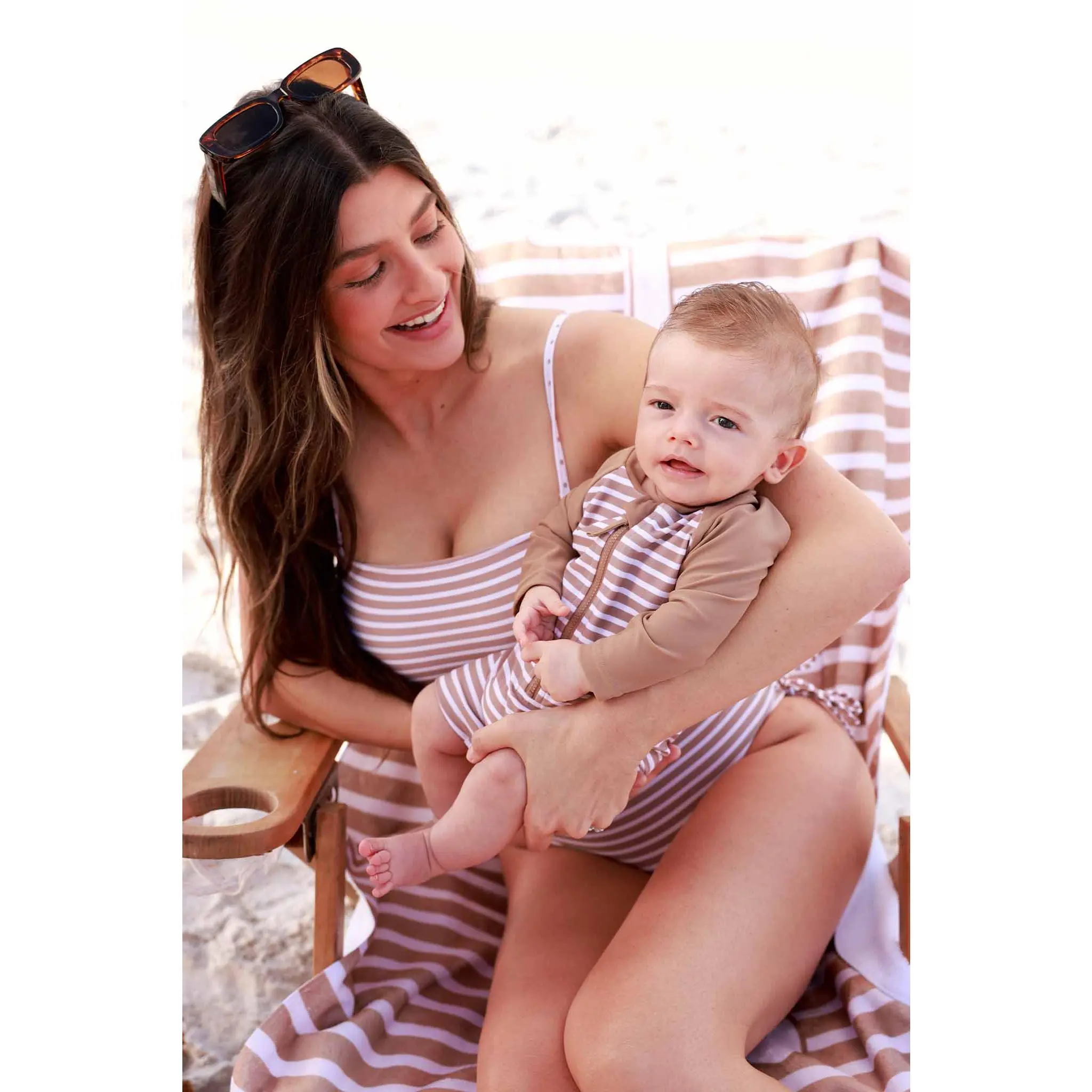 Sun, sand, and a swimsuit that actually works with you! The Sandy Stripes Women’s Removable Strap One Piece is part of our family matching swim collection, featuring neutral stripes with subtle polka dot accents for a look that feels timeless and easy to coordinate with the whole family. This suit is made for real-life beach days, especially for moms. The removable straps give you two looks in one; wear it with straps for extra support or remove them for a clean, strapless moment. It’s also a convenient pick for breastfeeding, making it easy to adjust when you need quick access without a full outfit change. Finished with adjustable side bows, you can customize the fit and add the cutest little detail at the same time. This is the perfect suit that is comfortable, flattering, and ready for all-day fun in the sun!
