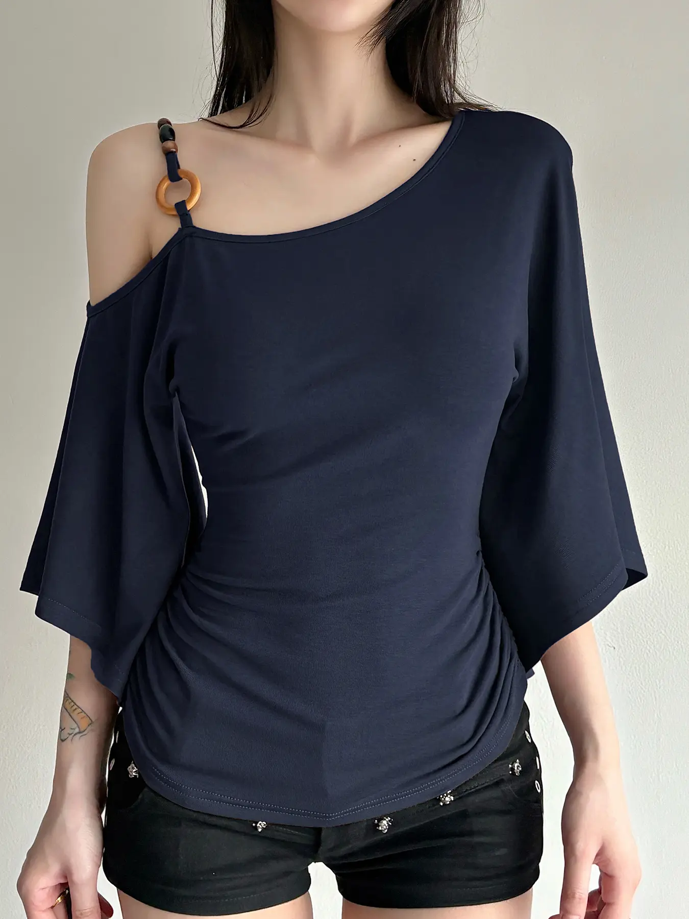 The cinch on the side of the shirt is perfect, just your body great. The flow of the sleeves are so beautiful.