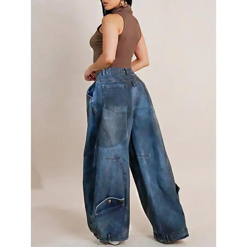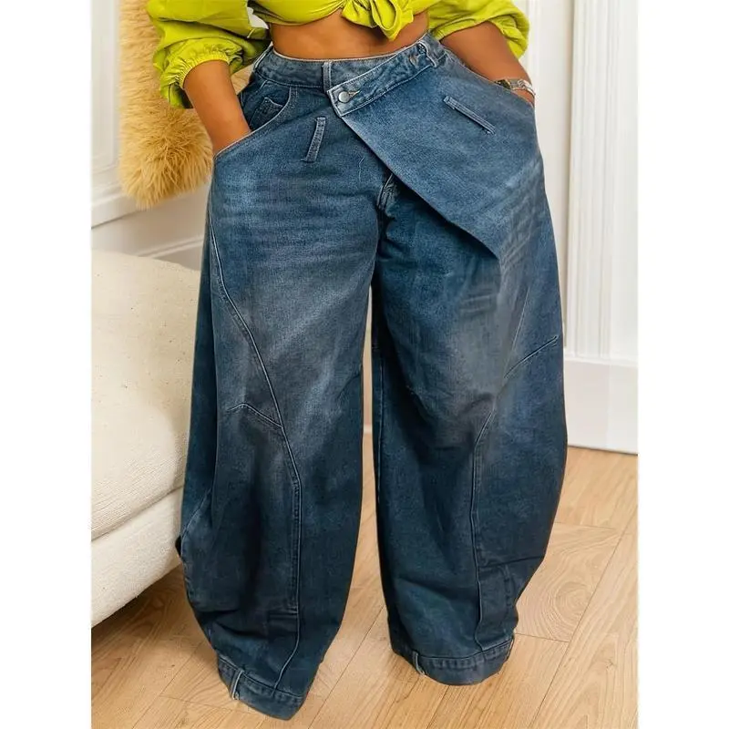 Women's Retro High Waist Wide Leg Jeans Cross Asymmetric Button Front Elastic Comfortable Denim with Functional Pockets Machine Washable Casual Pants Durable Fabric Suitable for Work Office Street Wear Daily Outings Shopping Trips Soft Breathable High Wa