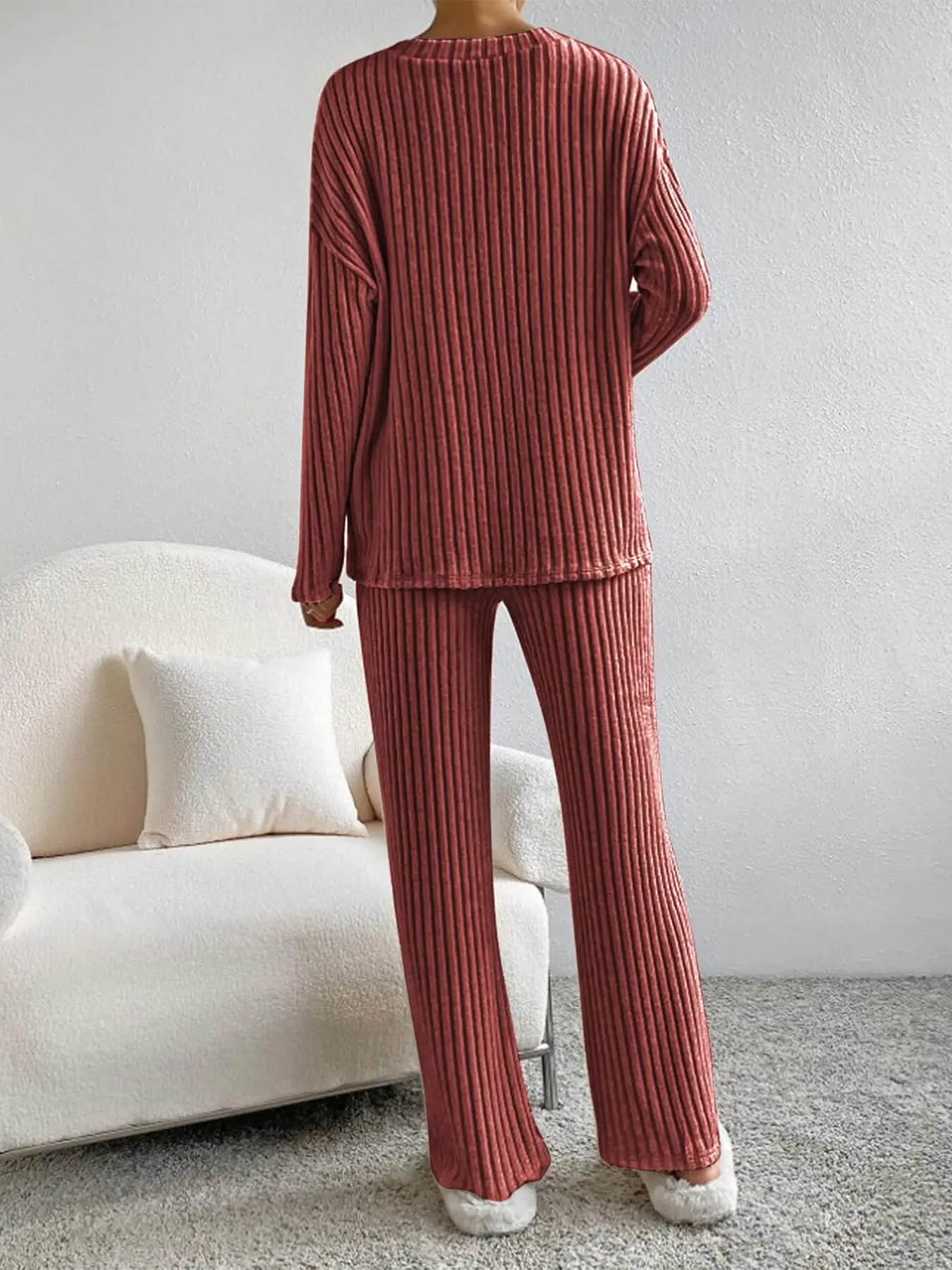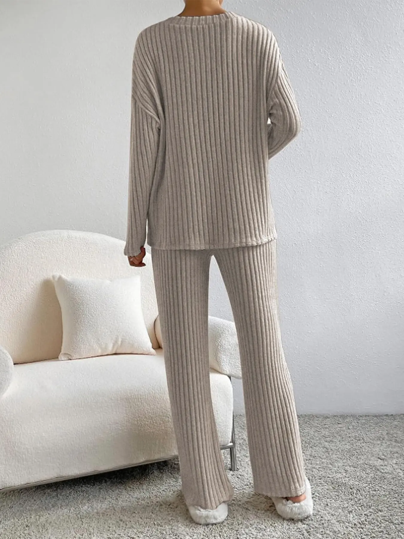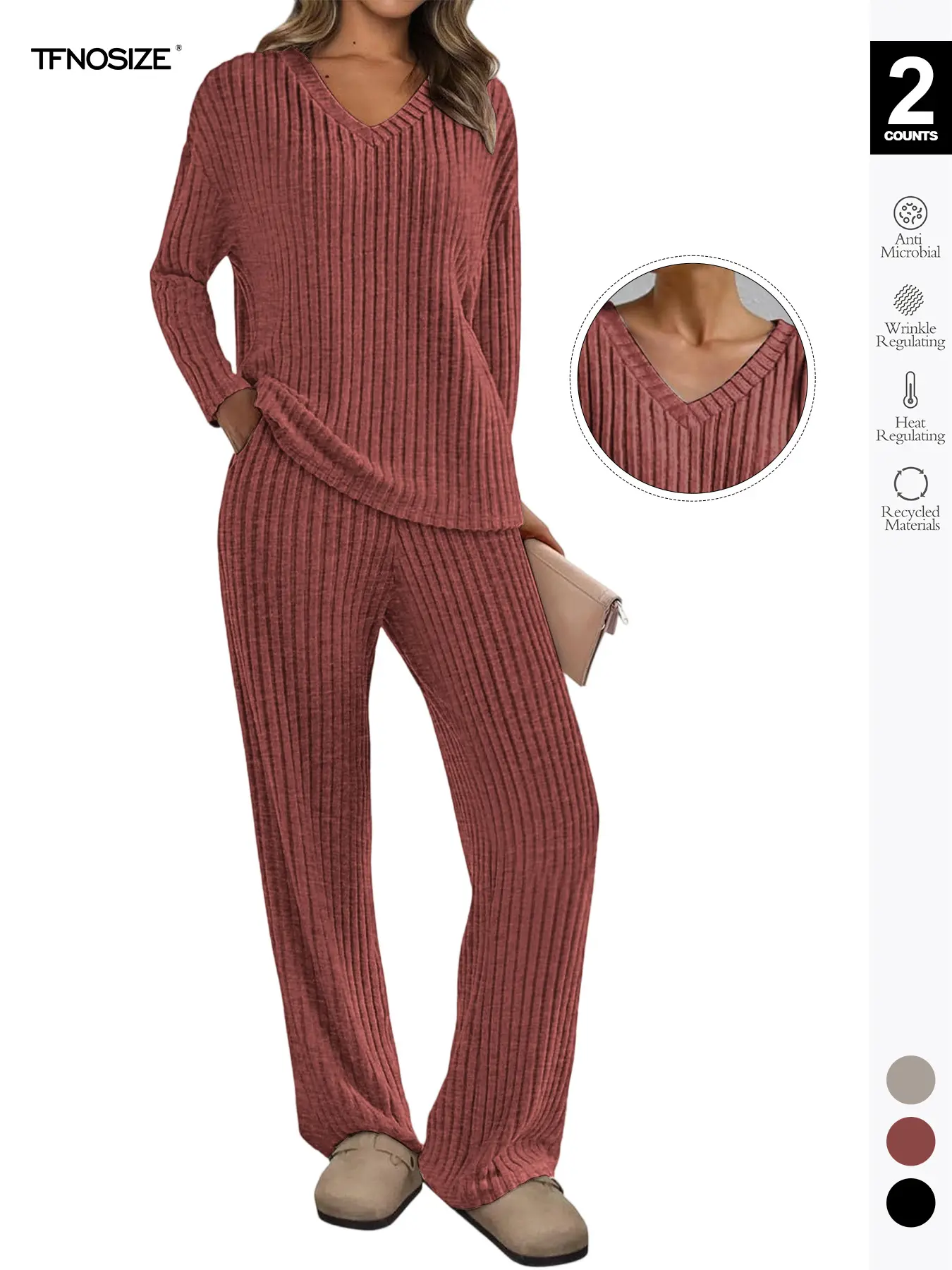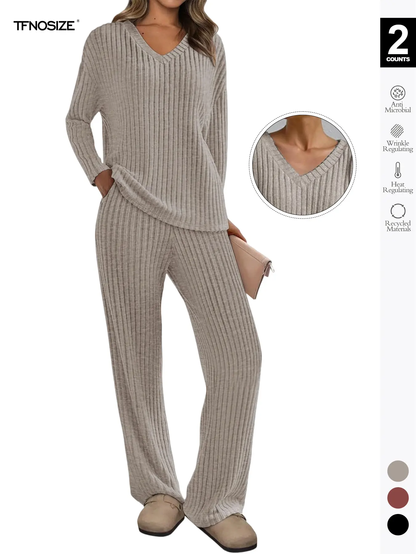 Women's Ribbed Knit 2-Piece Loungewear Set, V-Neck Oversized Long Sleeve Top, Wide-Leg Pants with Pockets, Soft Cozy Casual #pajamas #plussizesweatsuit #flatteringtwopieceset #comfy2piecesets #loungewearsets #usloungewearlooks #flatteringloungewear #threepiececomforterset #musthavepajamas #knitsleepwear