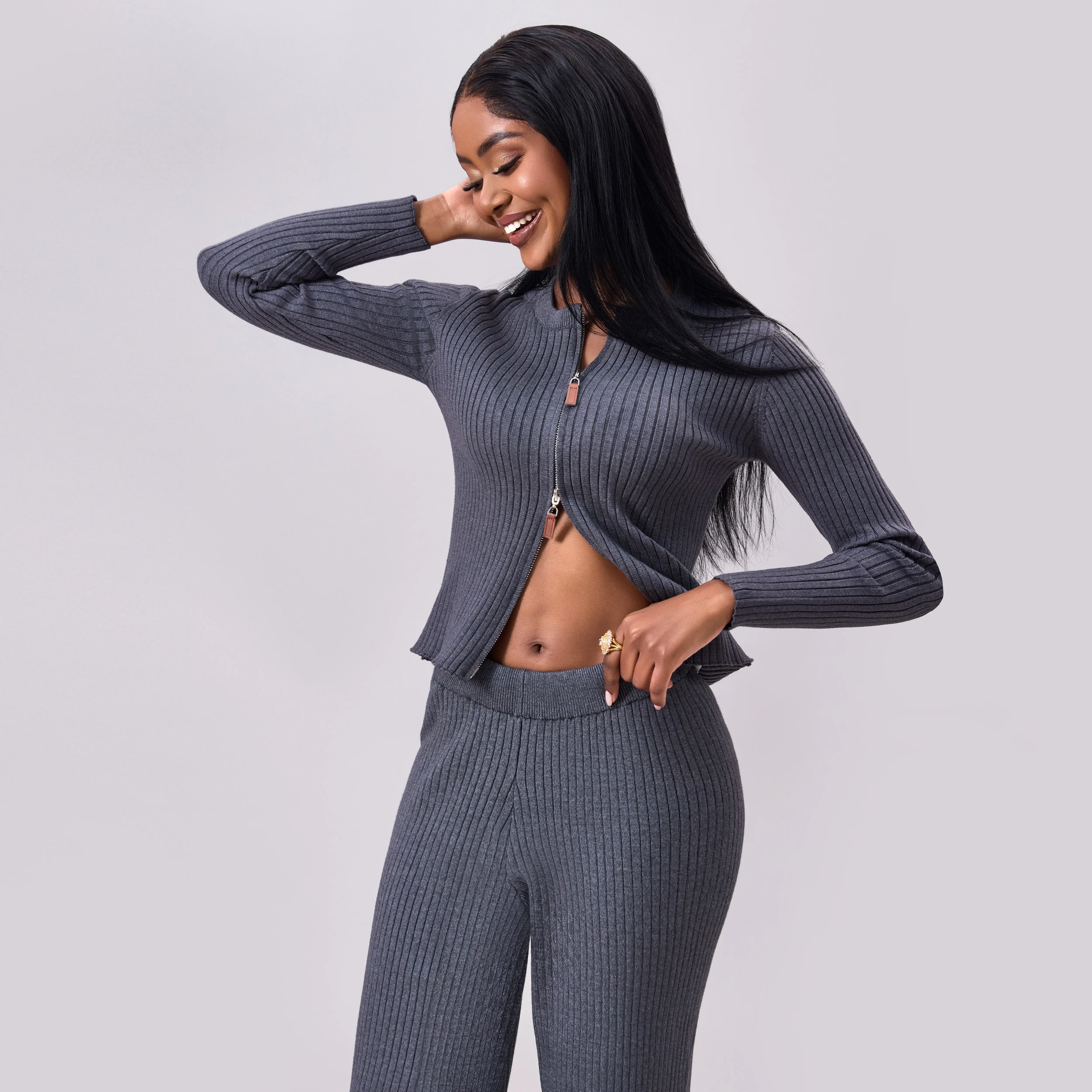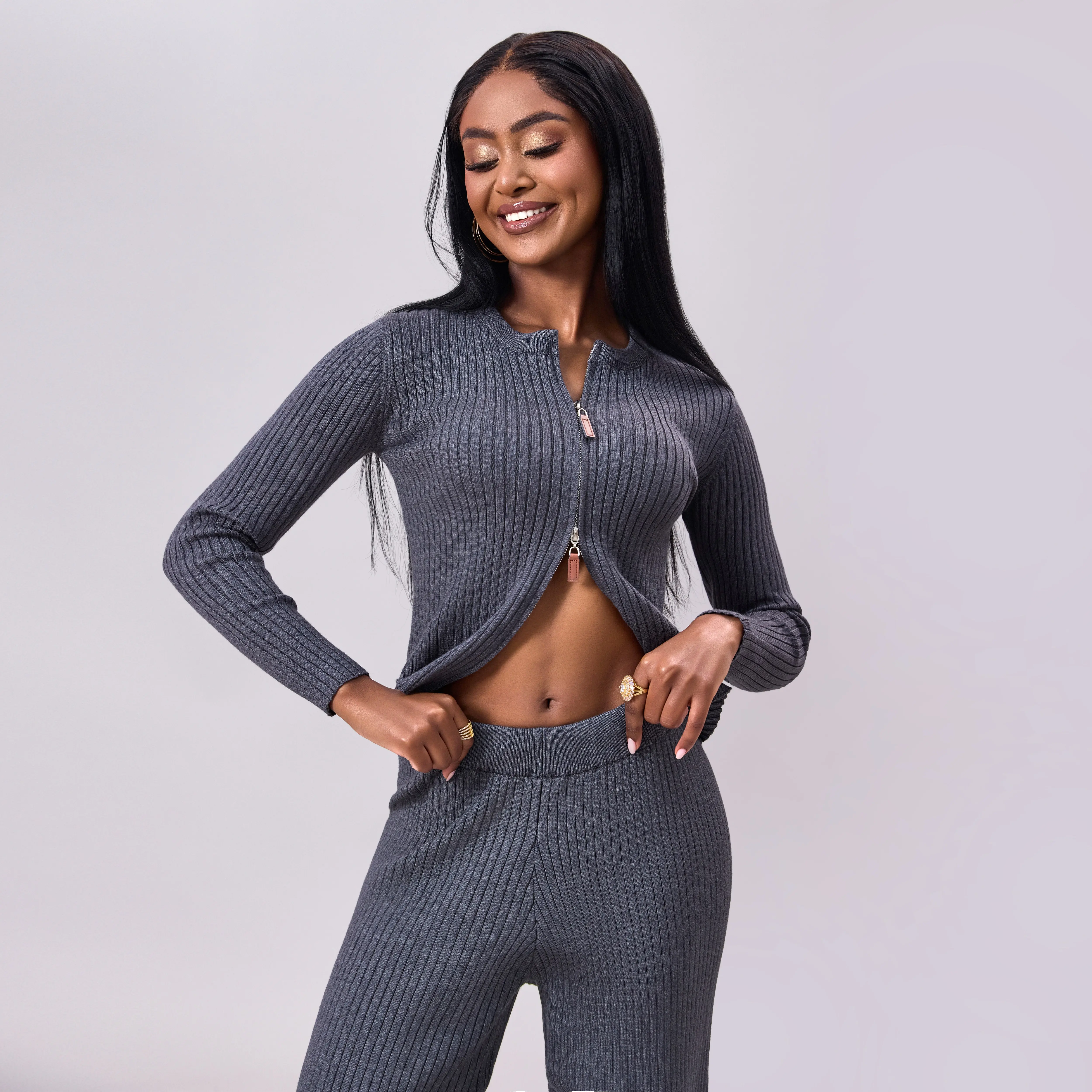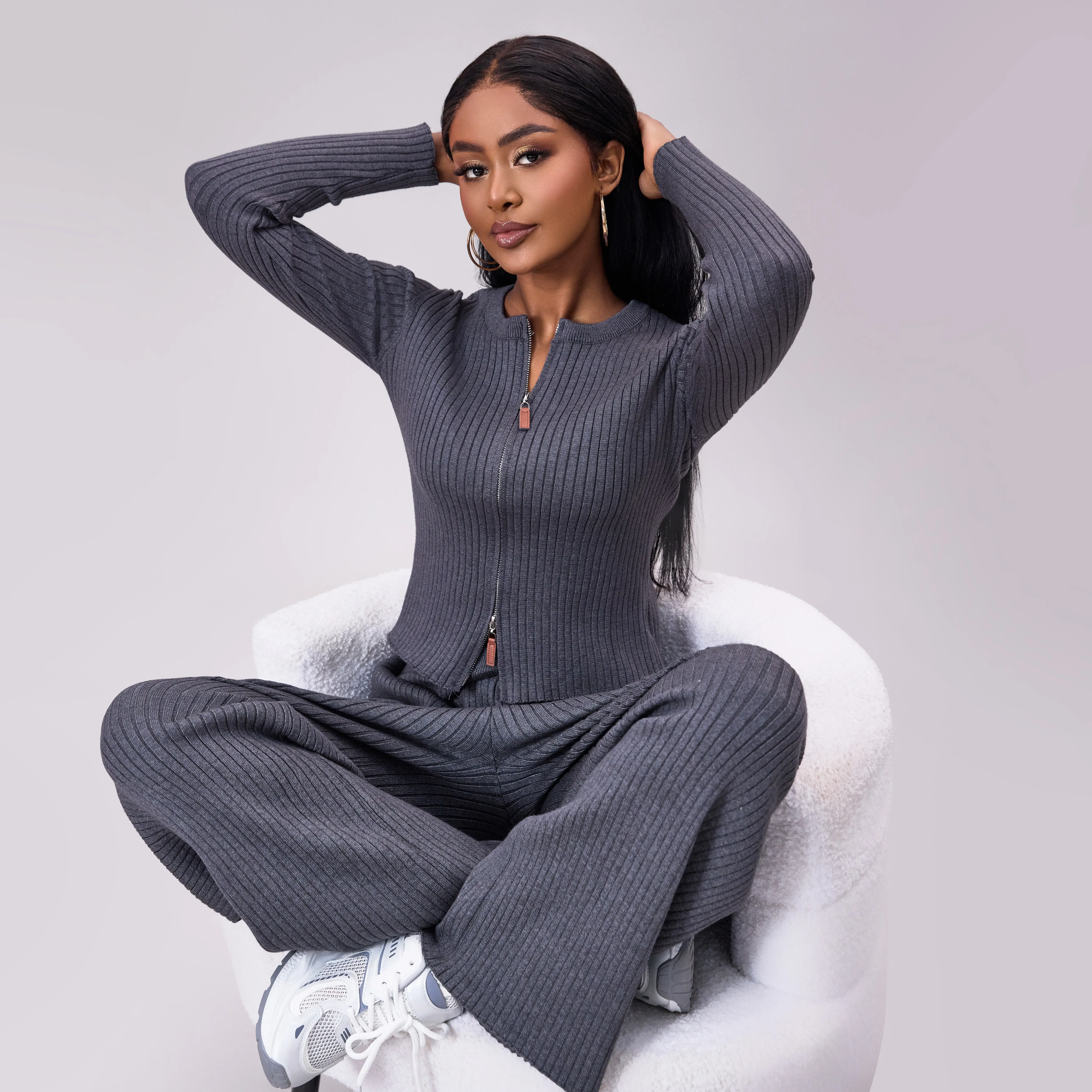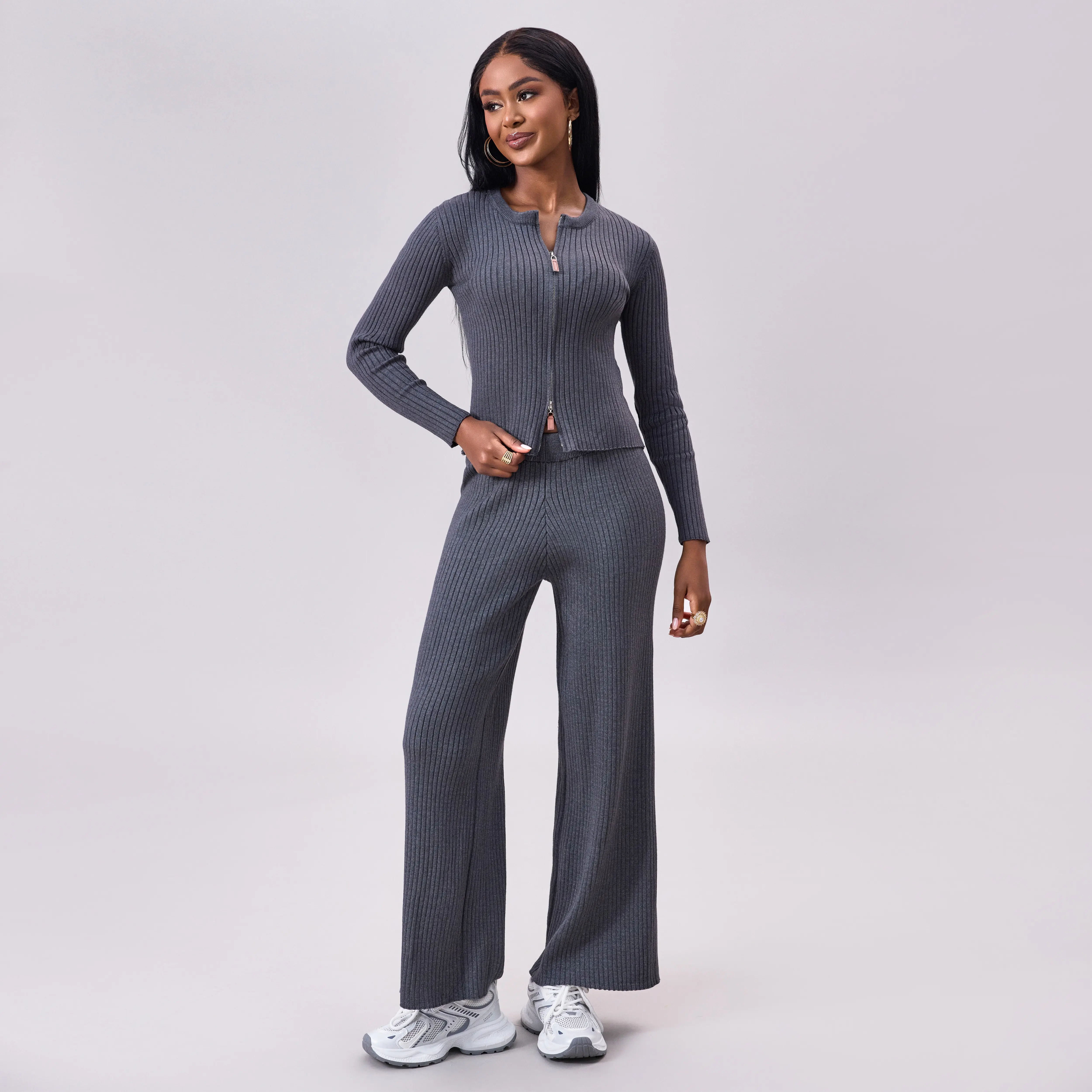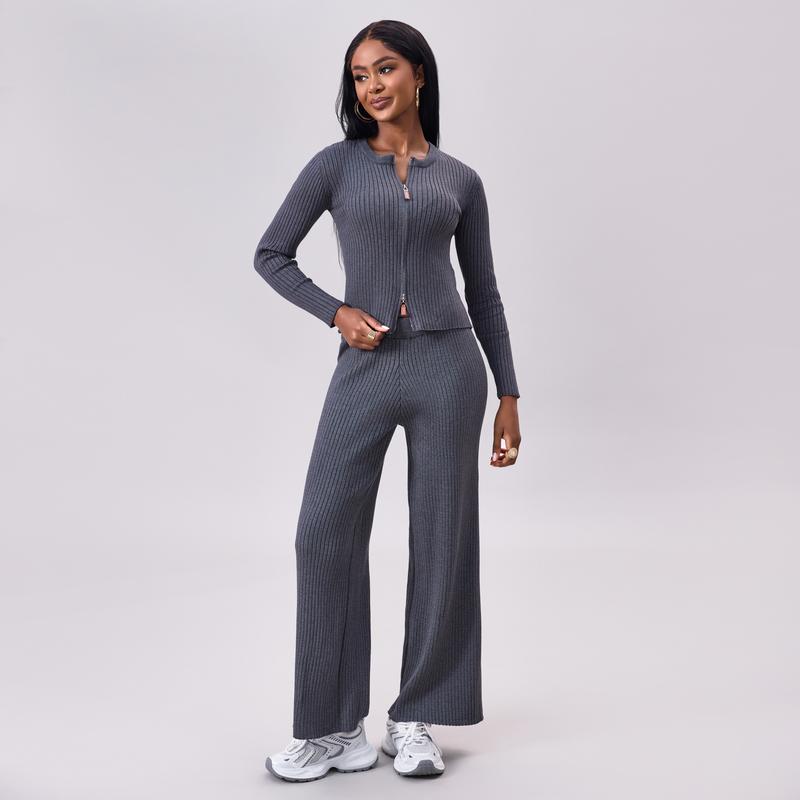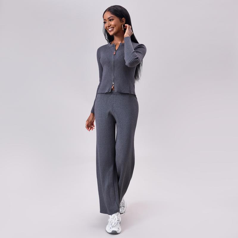 Upgrade your loungewear with our Ribbed Knit Zip-Up Cardigan and Wide-Leg Pants Set. This coordinated two-piece offers a form-fitting zip-up cardigan and matching wide-leg pants, perfect for relaxed days at home or casual outings. It’s also a chic travel outfit. Available in sizes S–XXL, check our size chart for the perfect fit.