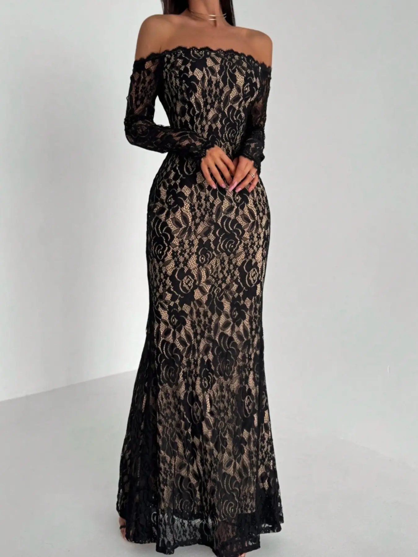 レディース 新セクシー レースオフショルダー ロマンティック スリム長袖マーメイドレス、デートやパーティーに最適、エレガントなイブニングガウン #wedding #ミニワンピース #レディーススーツ #ladiesfashion #ニットワンピース #sheinクリスマス感謝祭 #bridalcollection #partywear #sheinbigsalesday #longdress