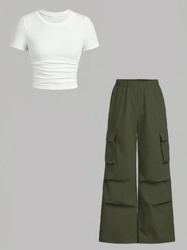 5. Women's Solid Ruched Ribbed Tee & Pocket Cargo Pants Two-piece Set, Street Fashion Short Sleeve T-shirt & Elastic Waist Trousers for Daily Wear, Ladies Two-piece Outfits for All Seasons