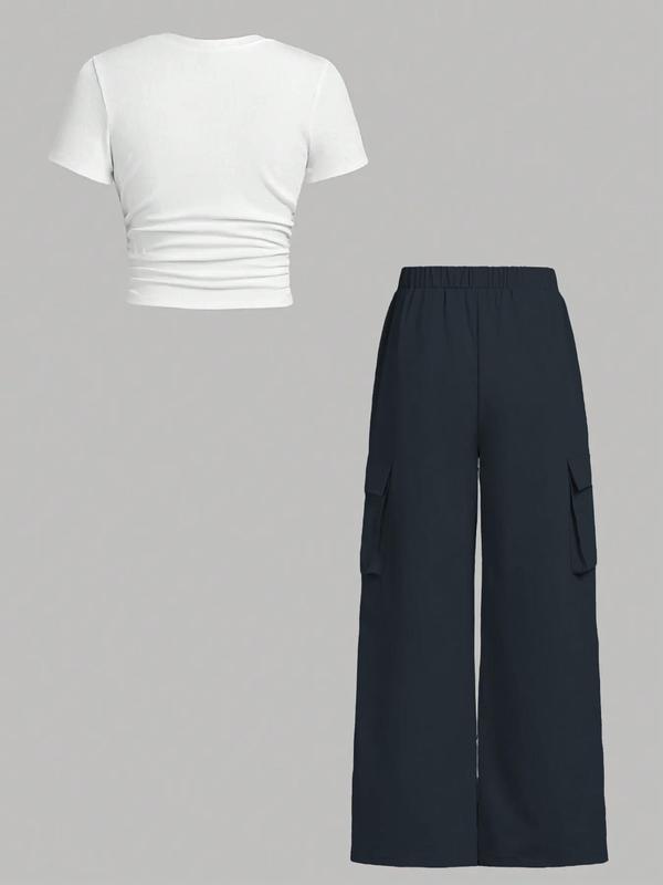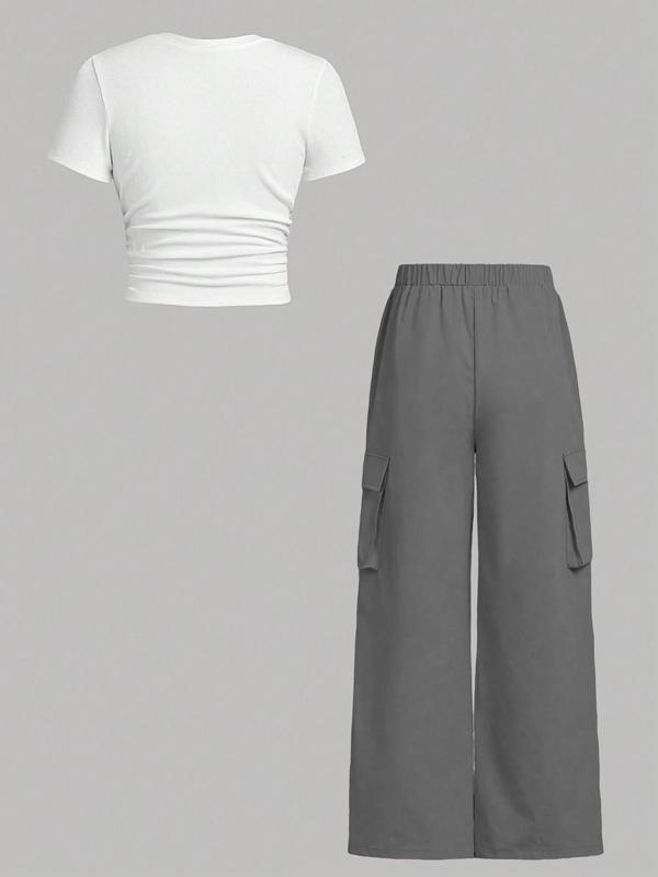 Women's Solid Ruched Ribbed Tee & Pocket Cargo Pants Two-piece Set, Street Fashion Short Sleeve T-shirt & Elastic Waist Trousers for Daily Wear, Ladies Two-piece Outfits for All Seasons
