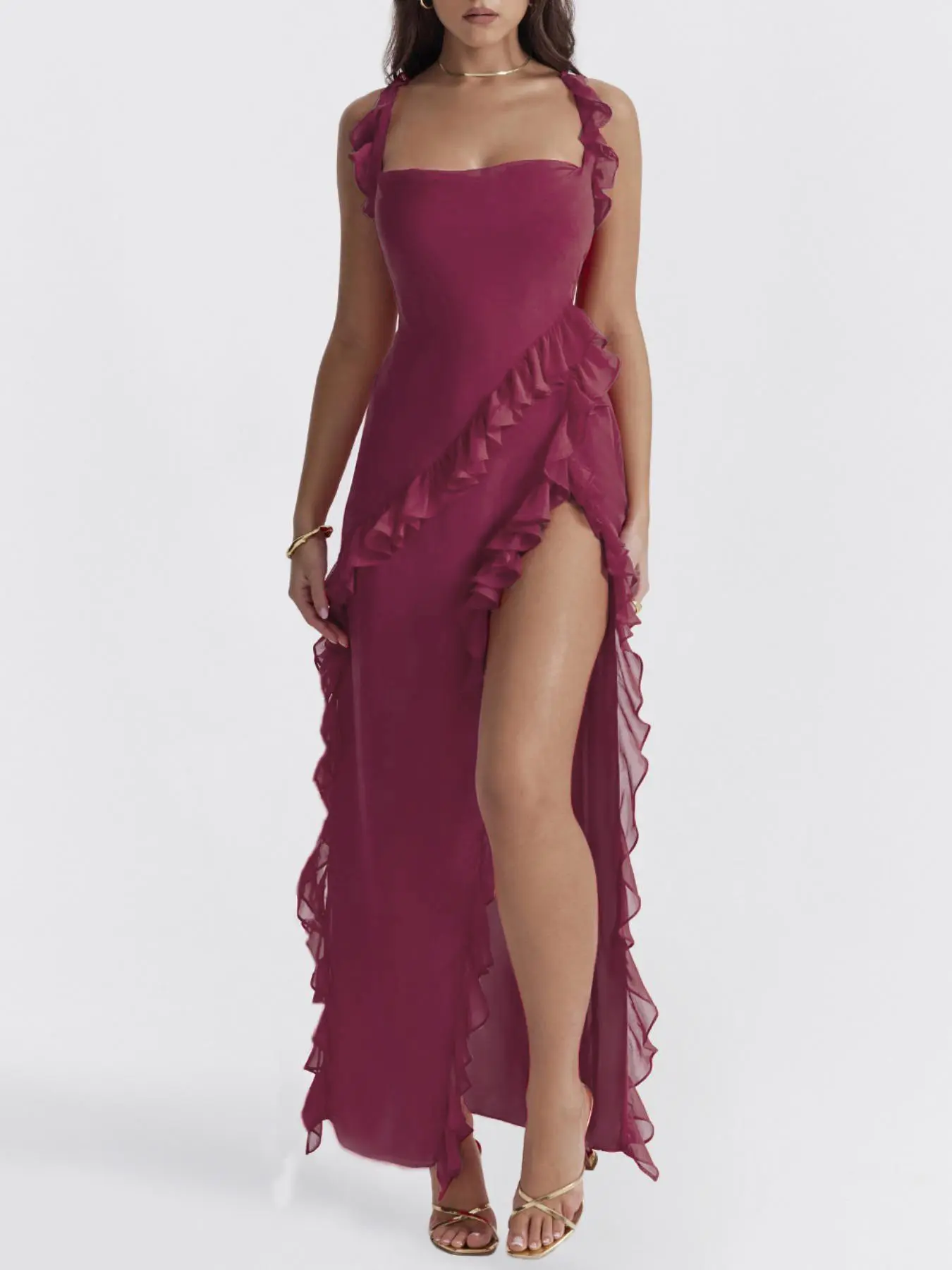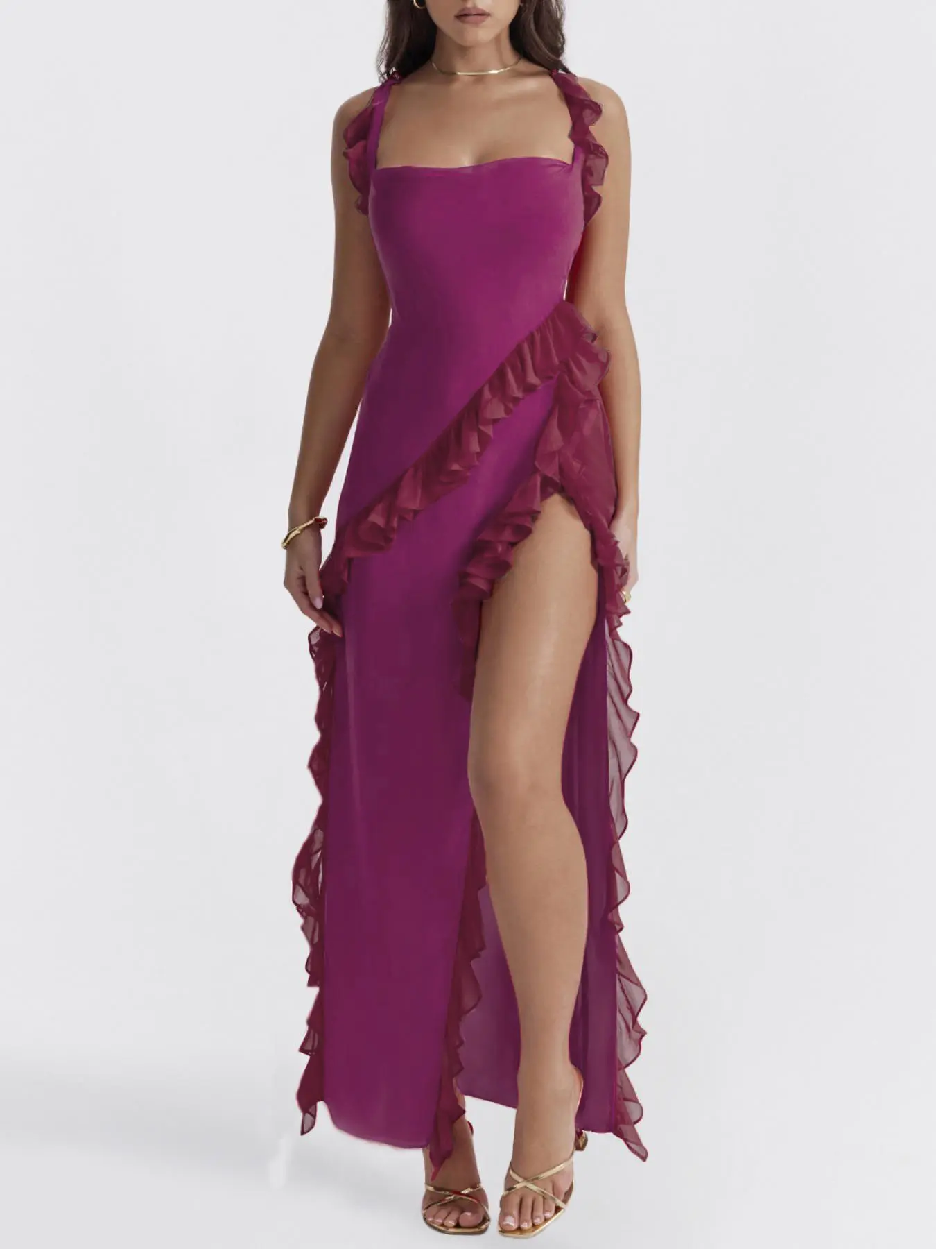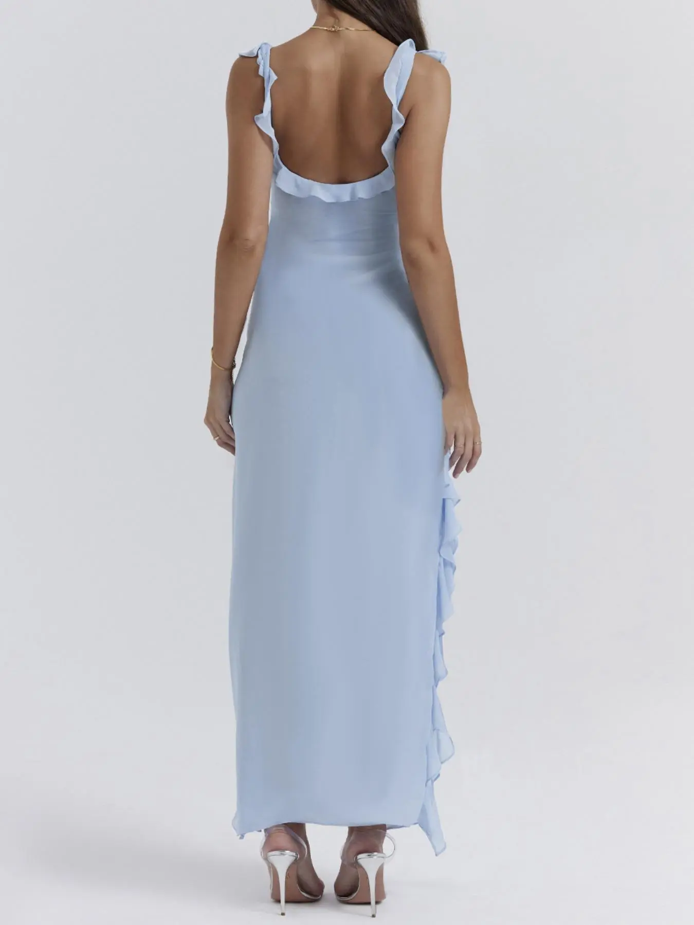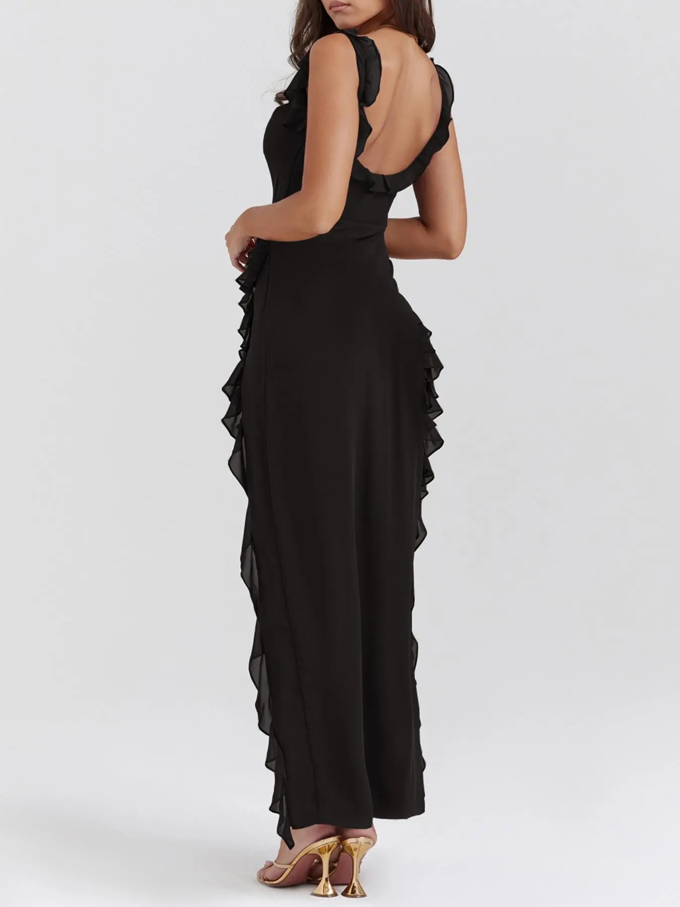 Women's Plain Ruffle Hem Split Thigh Dress, Elegant Slim Sleeveless Long Dress for Party Club Dating Wear, Ladies Summer Clothes