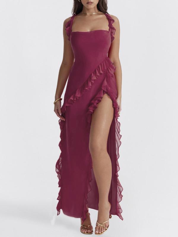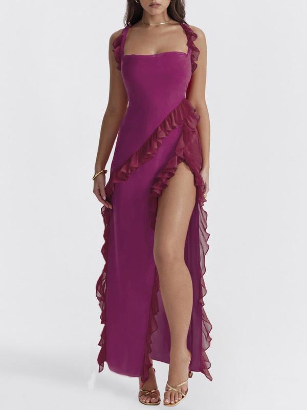 Women's Plain Ruffle Hem Split Thigh Dress, Elegant Sleeveless Long Dress for Party Club Dating Wear, Ladies Summer Clothes