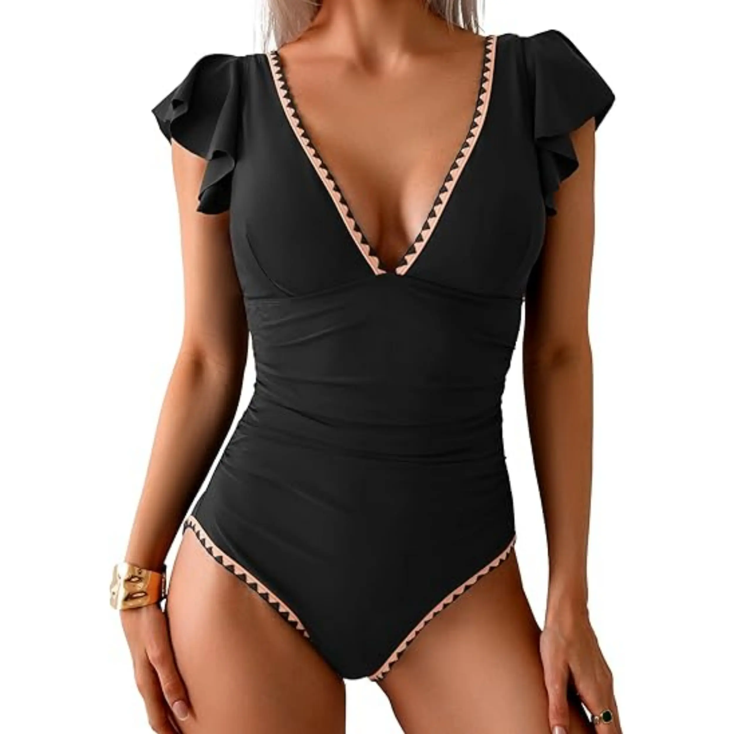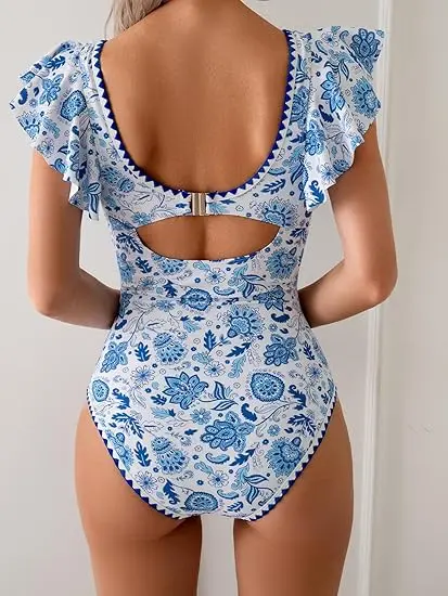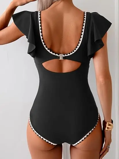 【Stylish Design】Flattering ruffle v neck flutter swimsuit with shell stitched details and fashion cutout u back with metal buckle perfectly show neck and back curves, makes you look chic, sexy and glamorous.