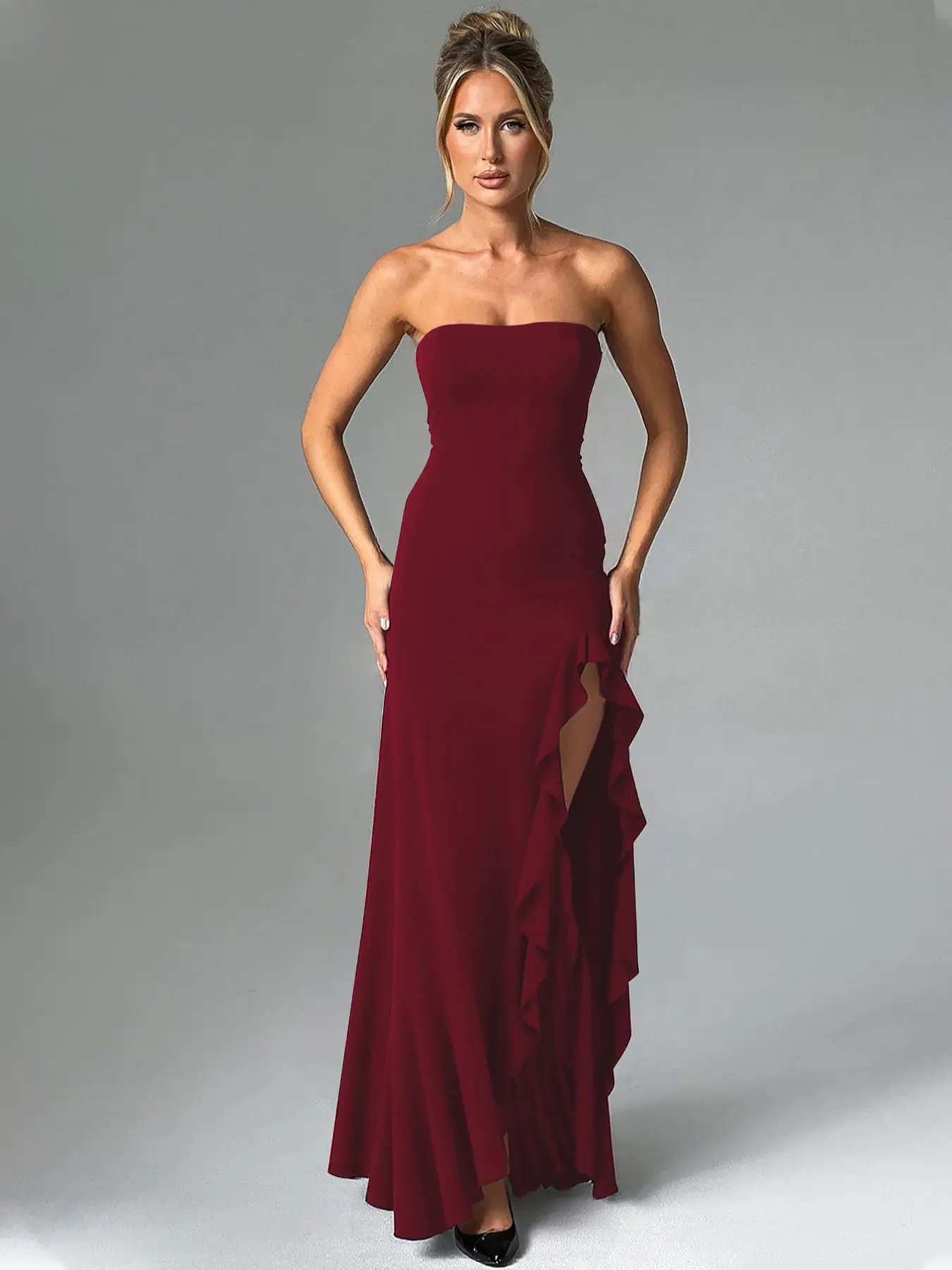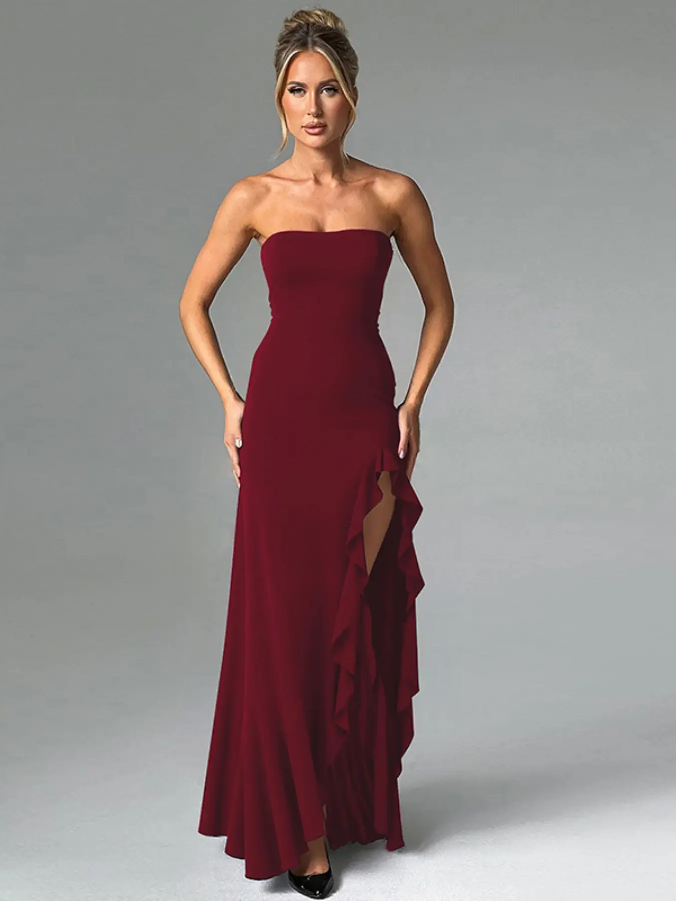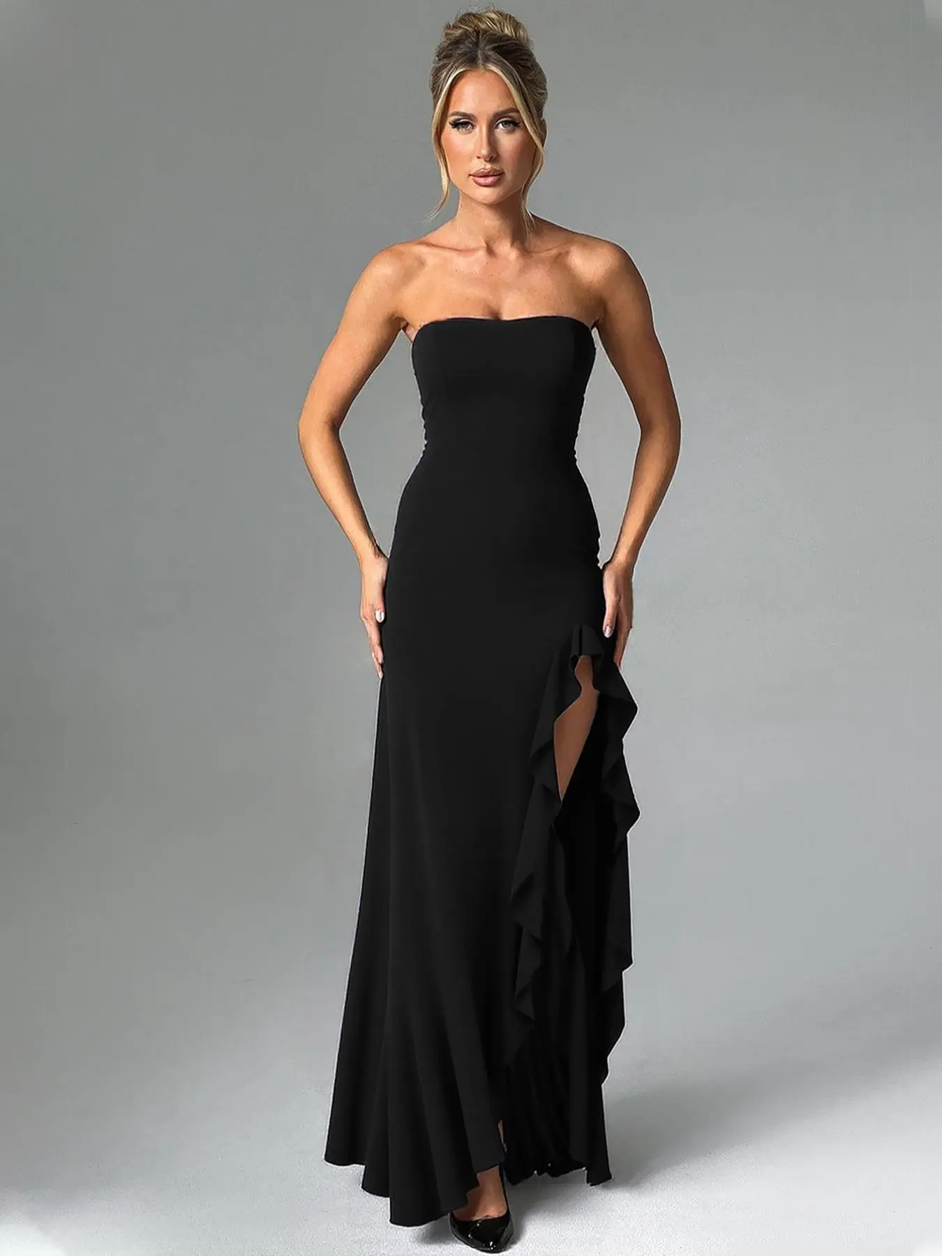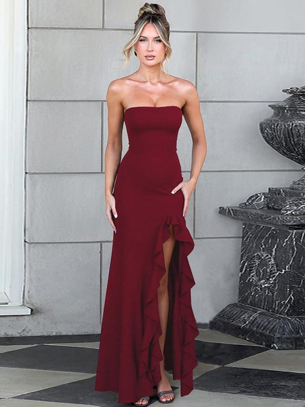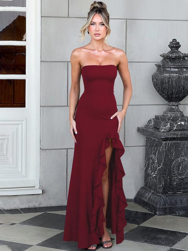 Women's Solid Color Ruffles High Split Off-Shoulder Sleeveless Bodycon Tube Dress Elegant Sexy Strapless Backless Ruched Slit Plain Birthday Party Club Evening Gown Holiday Long Full Formal Dresses for Ladies Girls Flattering Fitted Casual Clothes Wear