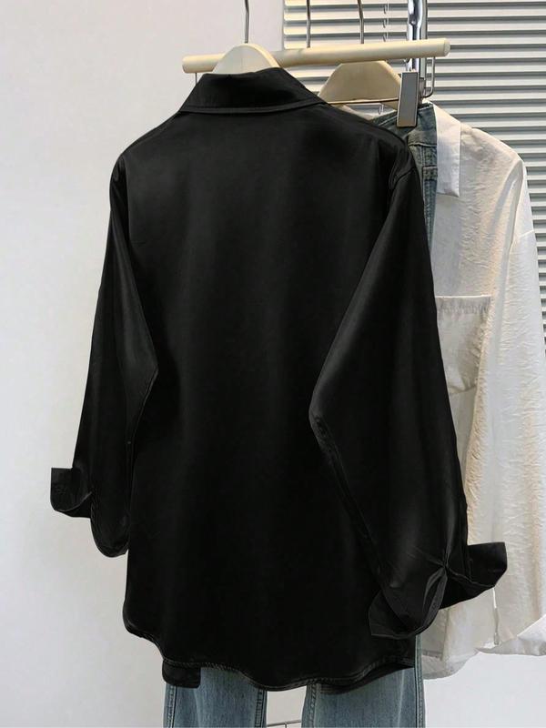 Women's solid color satin button-down long-sleeved casual shirt, made of fashionable silk fabric, suitable for casual office wear and commuting, and appropriate for both spring and autumn.