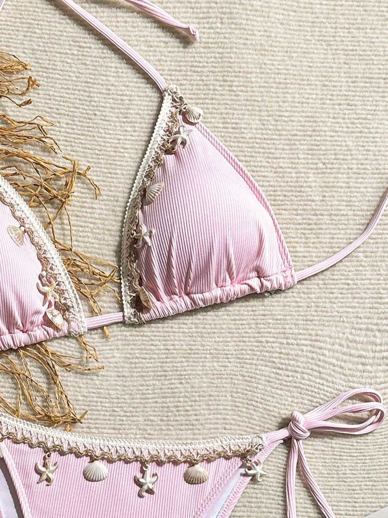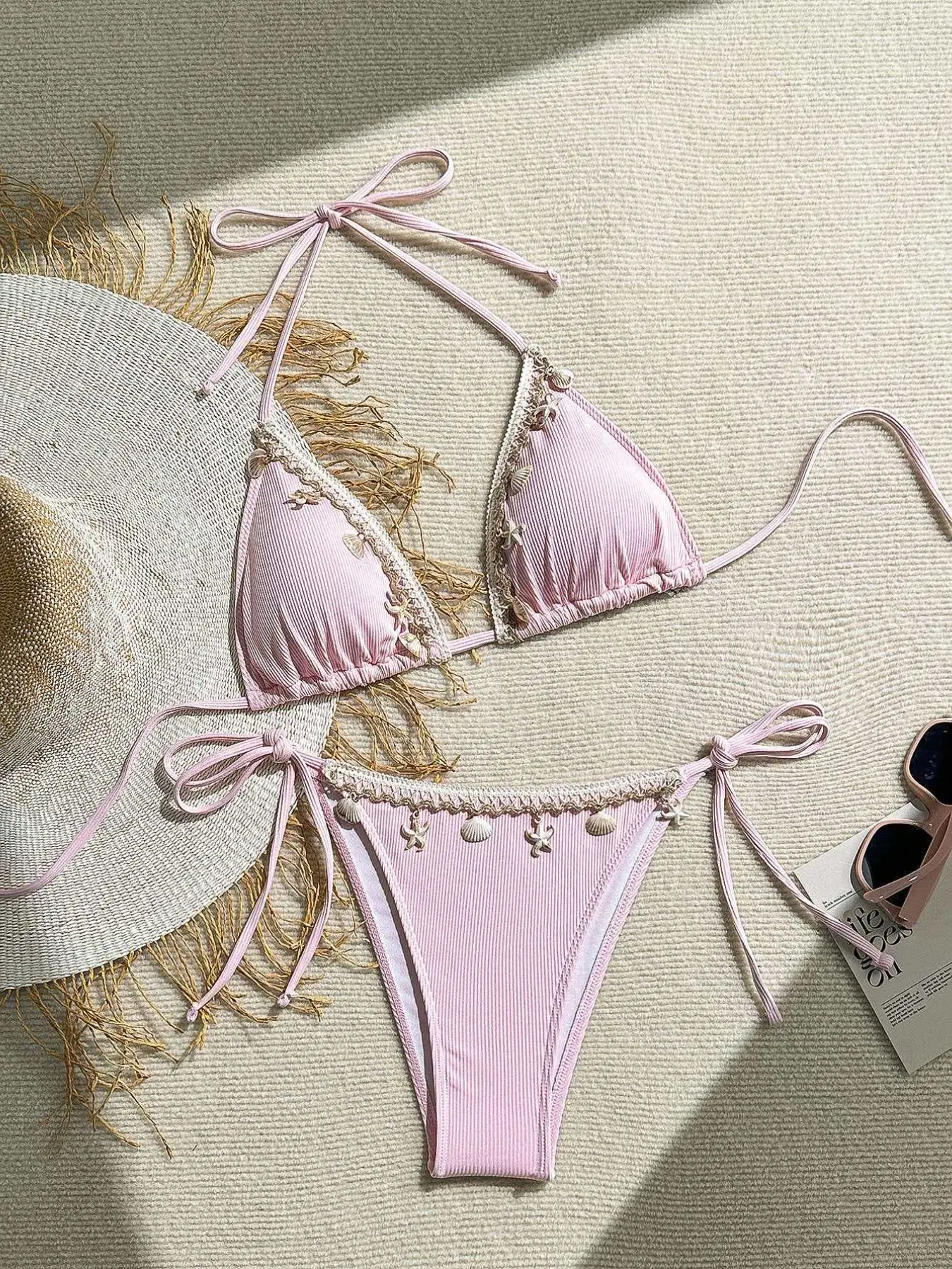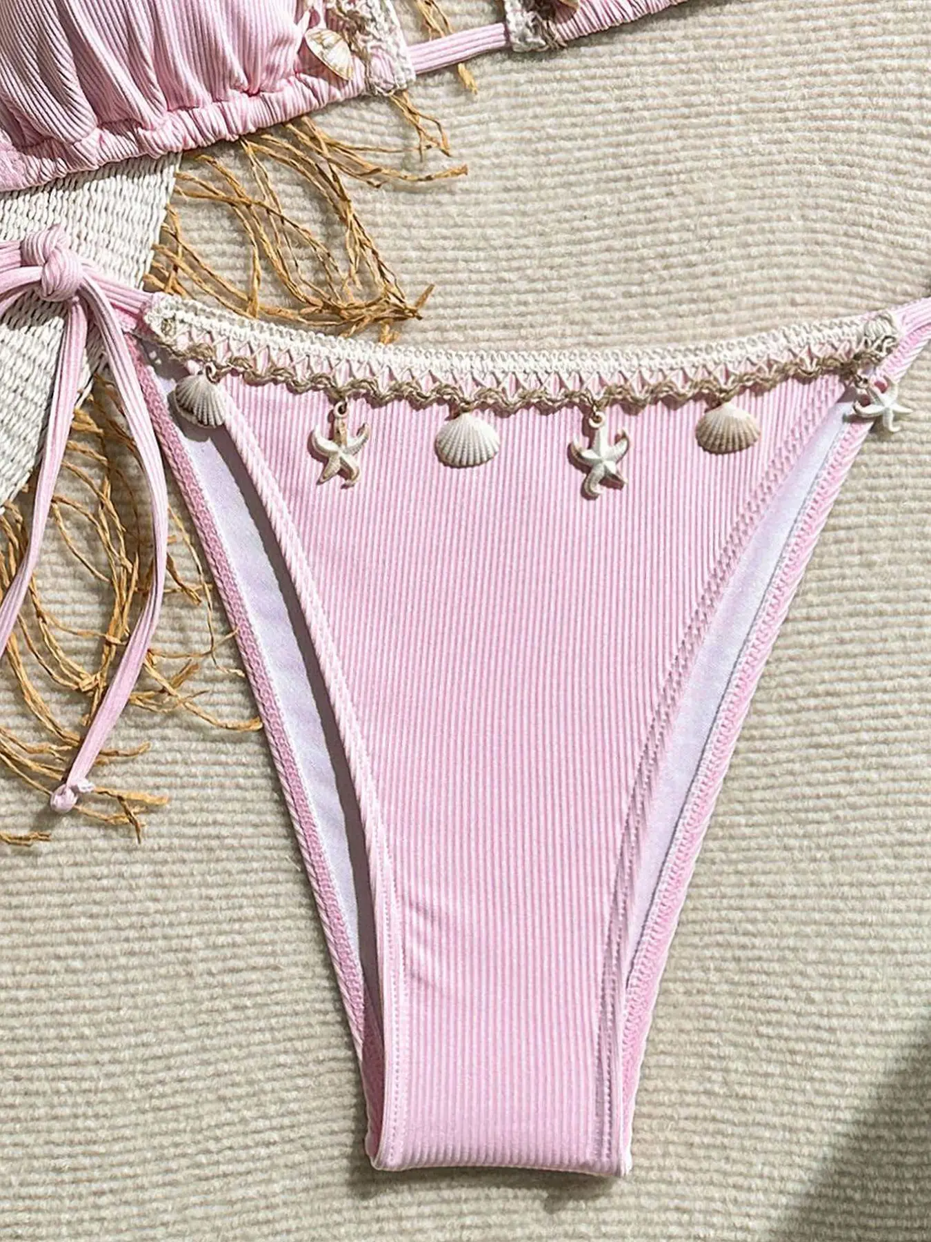 Women's Shell Beach Bikini Set, High Stretch Fabric, Includes Triangle Top and Side Tie Swim Pants, Ruched Bikini Set, Ruched Bikini Bottoms