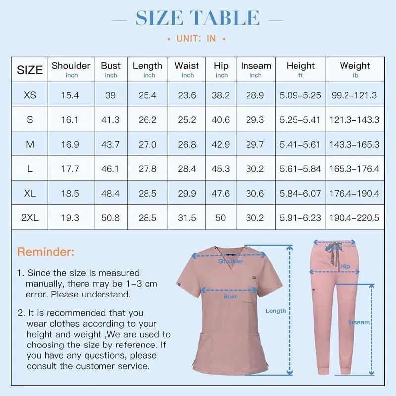 Scrub for Women| Classic V-Neck Top & Yoga Jogger Pants Medical Uniform Scrub SetComfort Meets Style �C Designed for Healthcare Professionals Why Choose This Scrub Set??Premium Fabric Blend: Soft, breathable, and moisture-wicking material for all-day comfort during long shifts.?Timeless V-Neck Design: Classic cut with adjustable drawstring waist for a flattering fit and effortless style.?Flexible Yoga Joggers: Stretchable jogger pants with elastic ankle cuffs for unrestricted movement �C perfect for active tasks.?Durable & Easy-Care: Machine washable and wrinkle-resistant, maintaining its shape and color after repeated use.?Versatile Utility Pockets: Multiple pockets (top & pants) for pens, ID cards, or small tools �C stay organized on the go. Perfect For:Nurses, Doctors, and Medical Staff| Gyms & Fitness Enthusiasts (off-duty style)|?Casual Wear for Everyday Comfort Why Shop Here?Ethically Sourced: Eco-friendly materials with sustainable production practices.True to Size: Detailed size chart ensures the perfect fit every time.Quick Shipping: Delivered in 5-7 business days with tracking. Upgrade Your Workwear �C Ditch the boring scrubs and embrace functionality and fashion. Order now and experience the difference! The above is a detailed introduction to the product. Wish you a pleasant shopping experience!