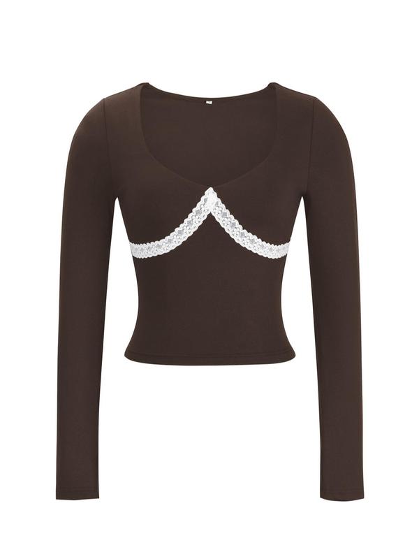 Women's Sexy Deep V Lace Patchwork Long Sleeve Top, Autumn Winter Casual Fashion, Slim Fit Women's Clothing for Daily Wear