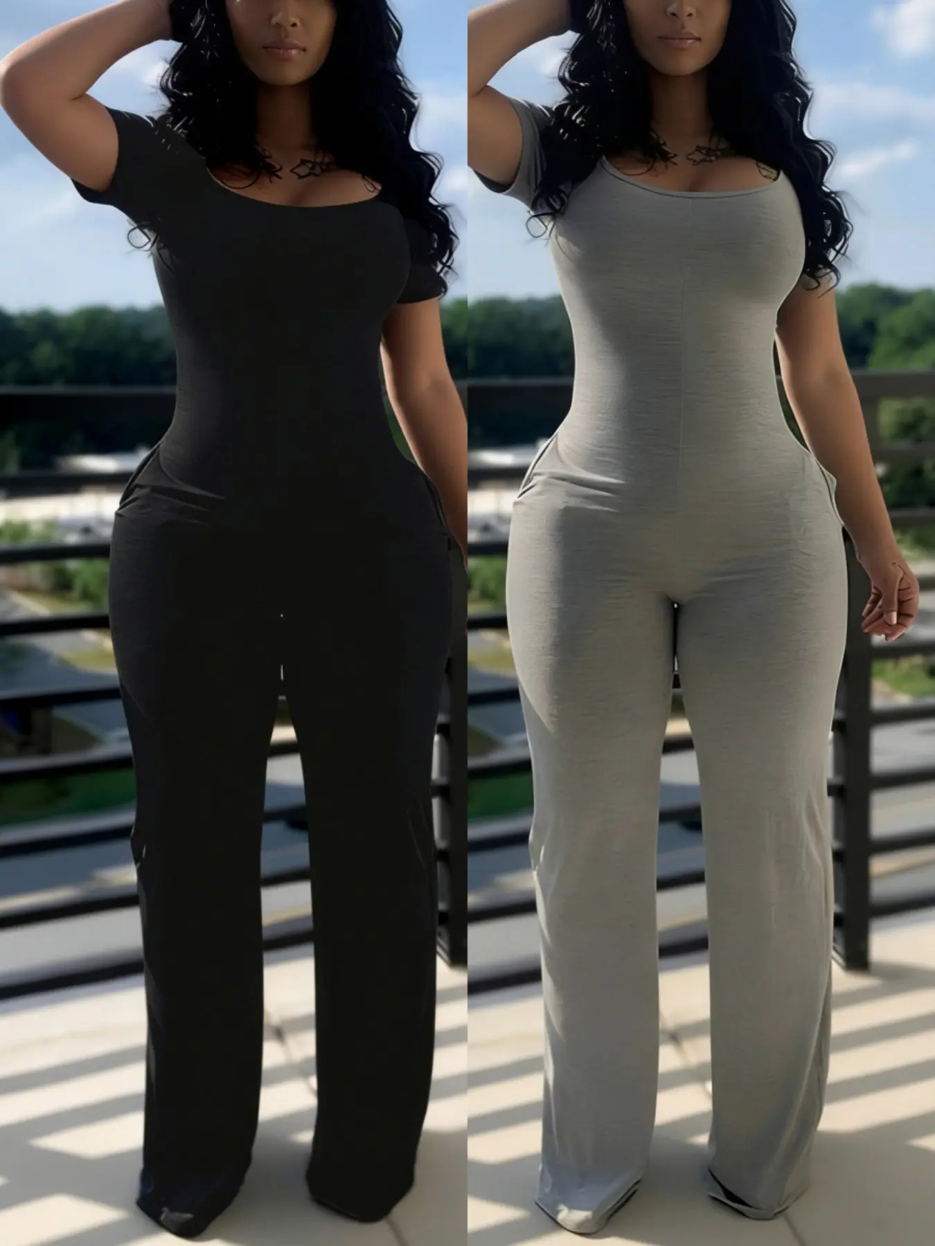 Women's Sexy Fitted Short Sleeve Jumpsuit, Plain Low Neck Pocket Design#jumpsuit #bodysuit #OOTD #tiktokshop #spotlightfinds