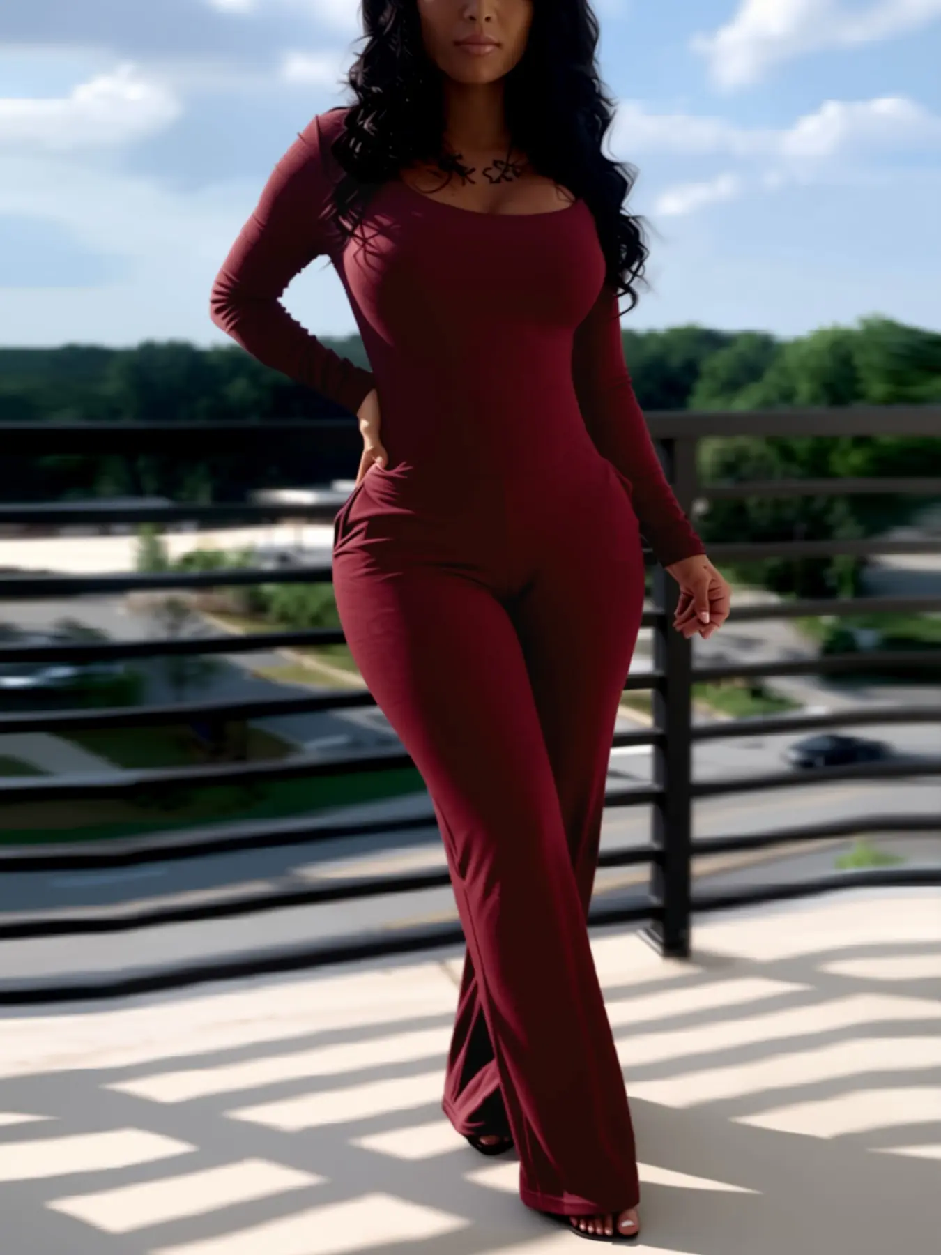 5. Women's Sexy Fitted Plain Long Sleeve Jumpsuit, Fall & Winter Fashion, Low Neck Pocket Design, European Style, Casual Wear
