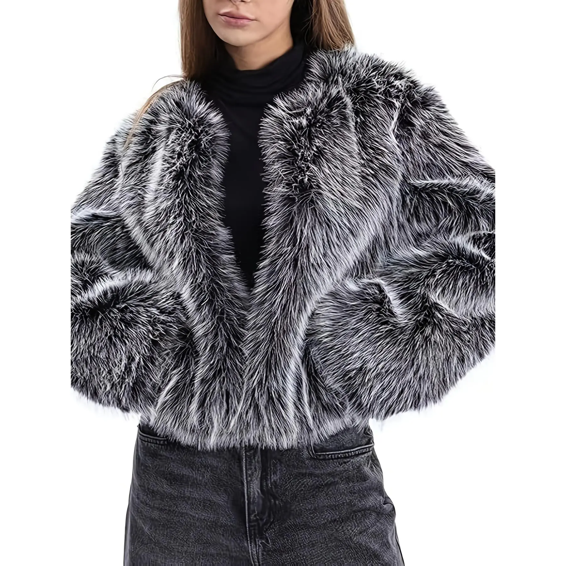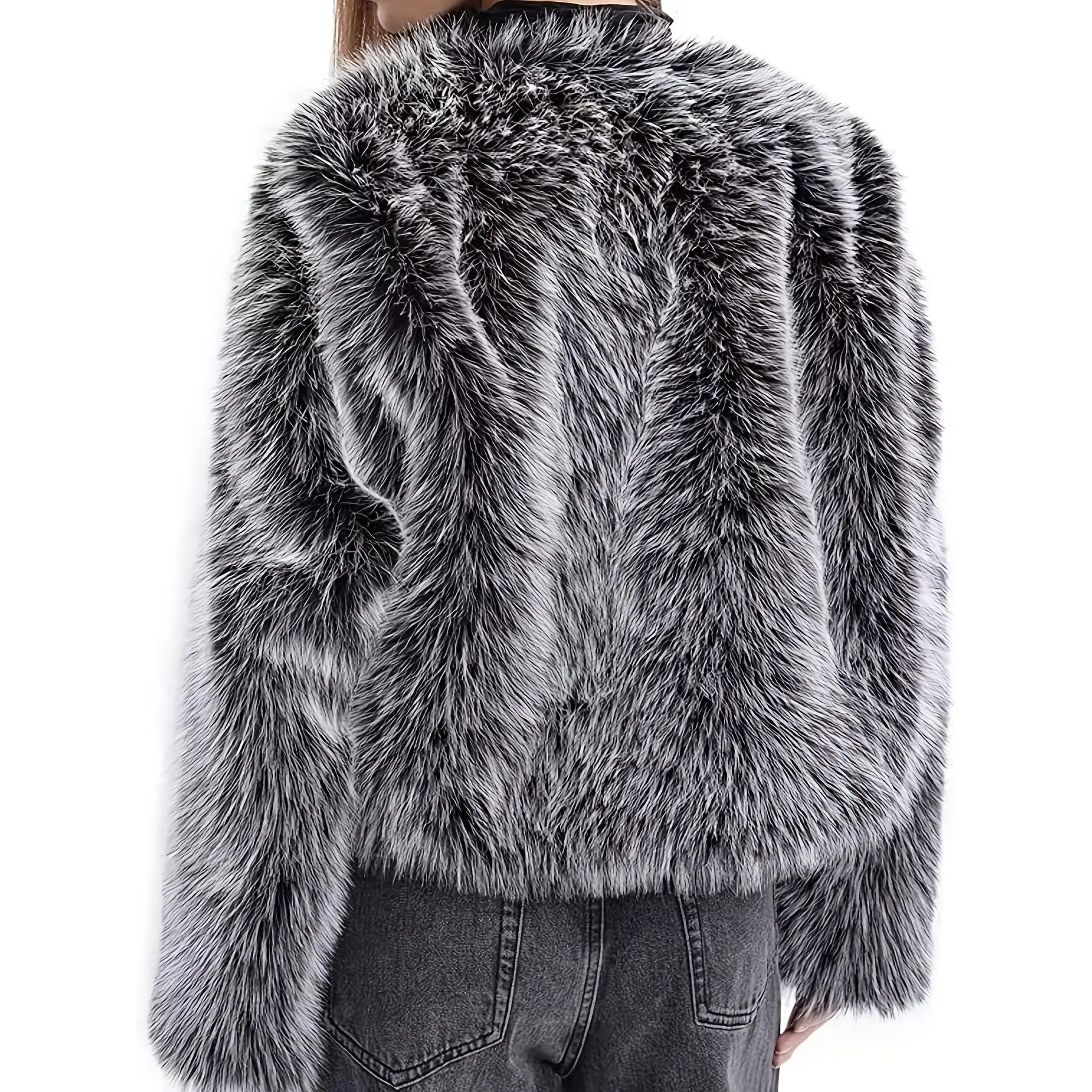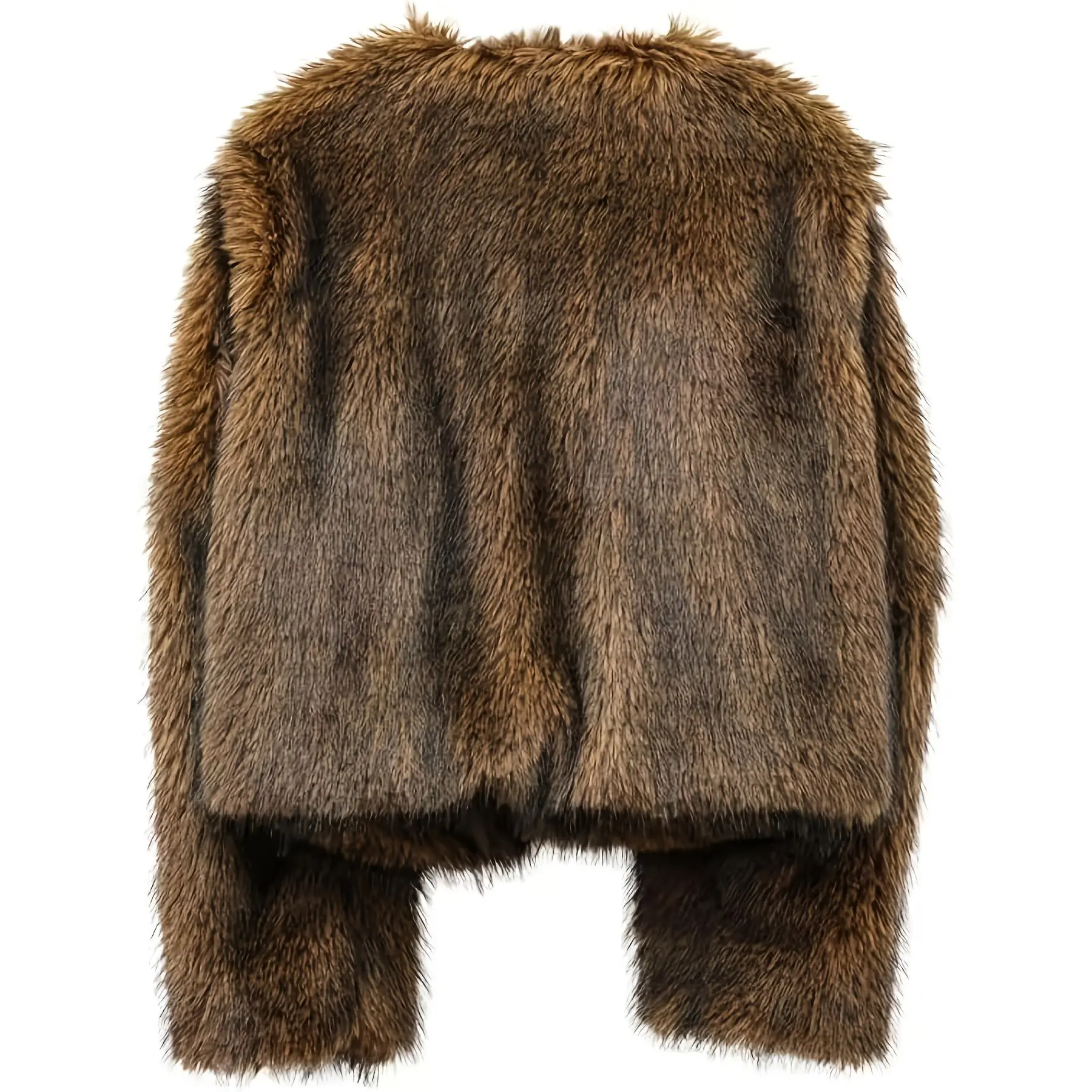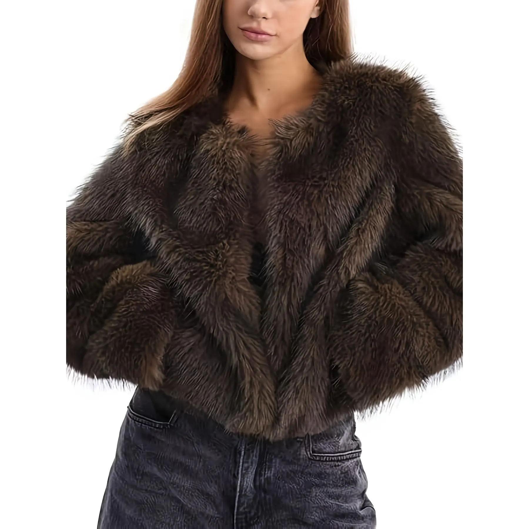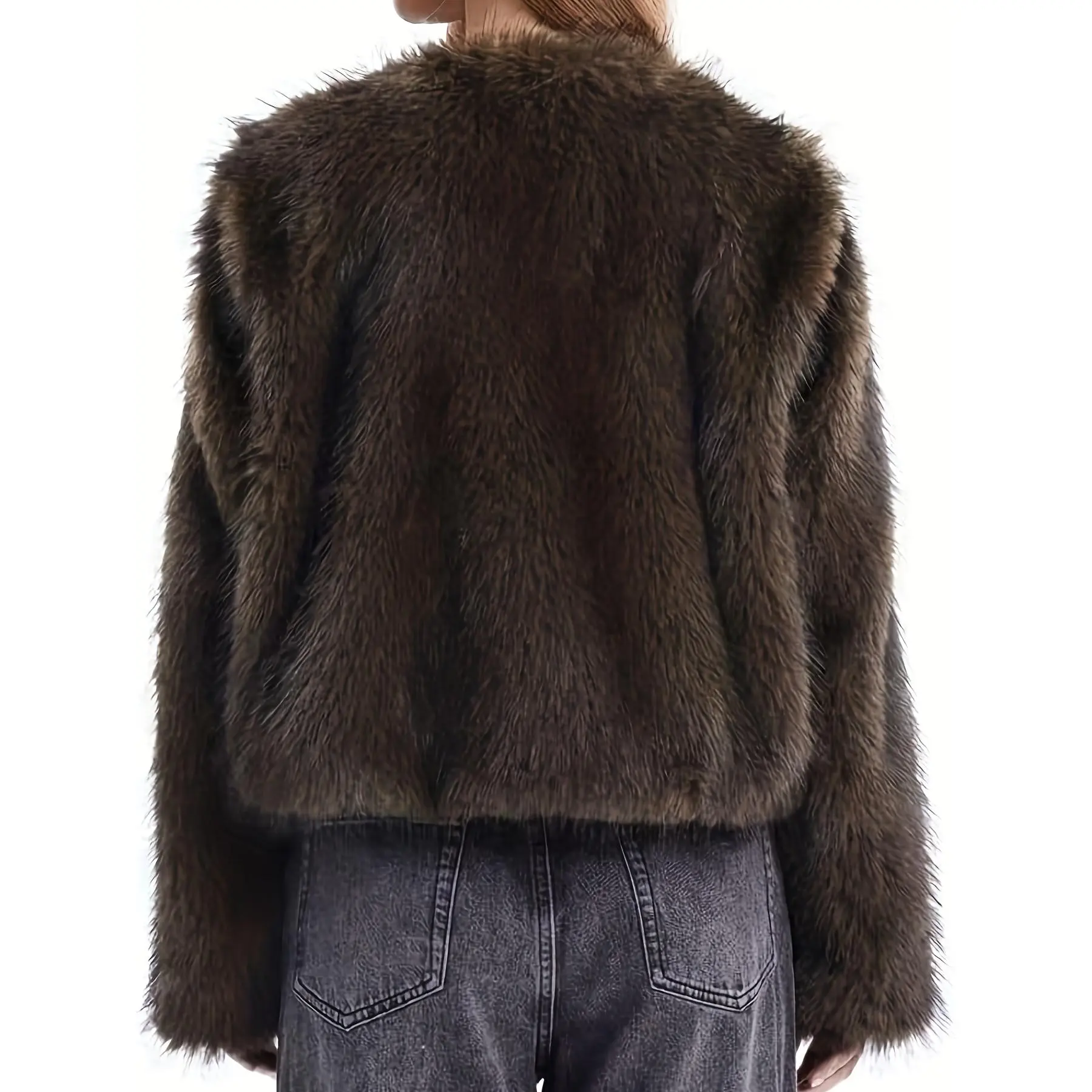 Women's Short Faux Fur Jacket - Brown Winter Coat with Pockets, Collar & Single-Breasted Closure, Hand Washable Synthetic Outerwear for Casual & Business, Short-Length Warm Coat - Fall/Winter Blazer