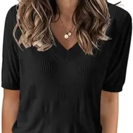 ·Features: V neck, short sleeve, small puff sleeve, solid color, special ribbed block pattern, regular fit