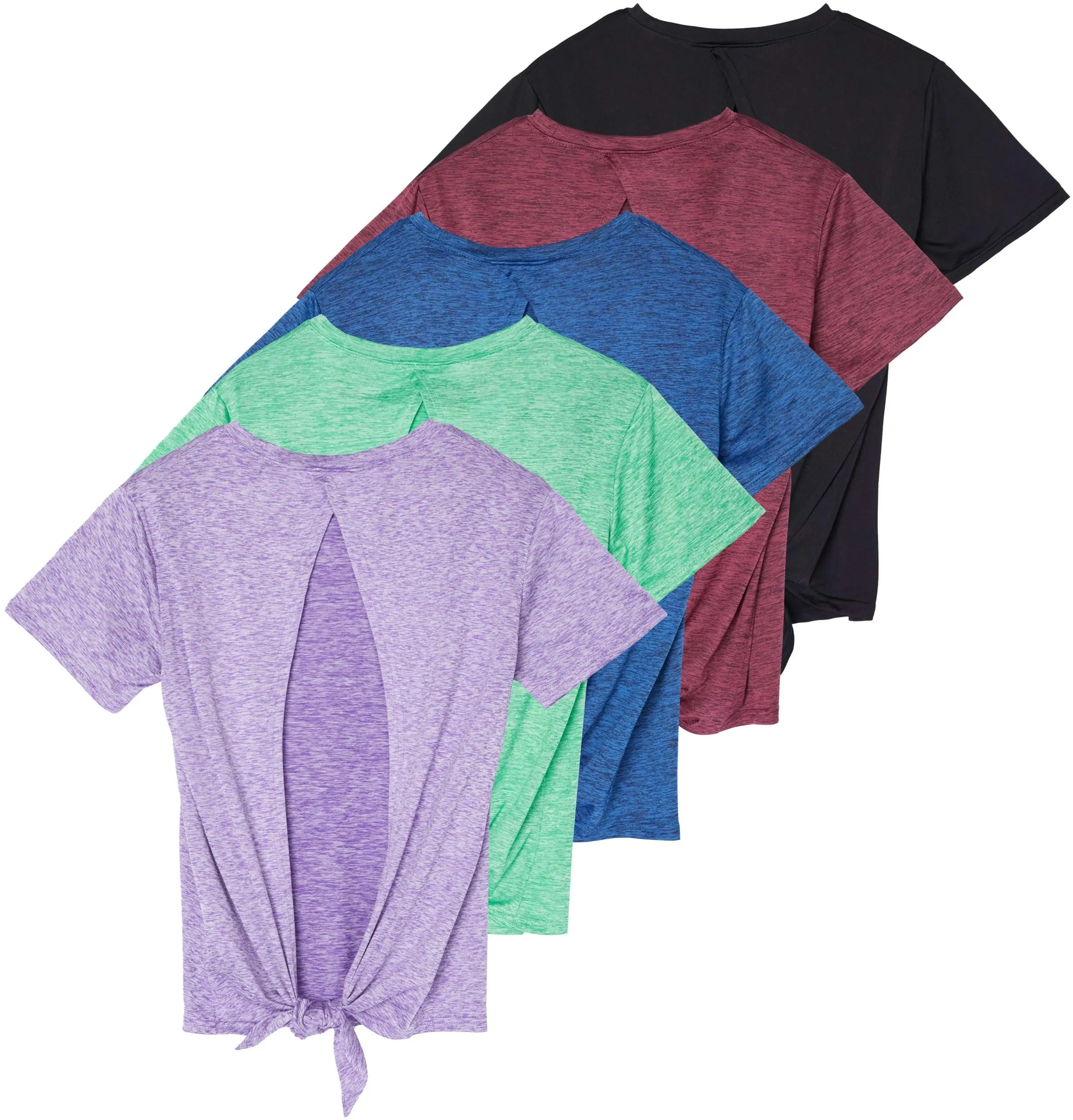 Elevate your active wardrobe with our 5-Pack Women's Tie-Back Dry-Fit Short Sleeve Active T-Shirts! Designed for the modern woman who values both style and performance, these tees are the perfect companion for workouts, sports, and everyday activities. Crafted from high-quality dry-fit fabric, these shirts are engineered to keep you cool and dry, thanks to their advanced moisture-wicking properties. Say goodbye to uncomfortable sweat patches and hello to a fresh, dry feel throughout your day. Whether you're hitting the gym, going for a run, practicing yoga, or playing tennis, these shirts will move with you effortlessly. Our shirts boast a loose, comfortable fit that allows for unrestricted movement, making them ideal for all types of workouts. The soft, lightweight material feels gentle against your skin, ensuring maximum comfort during even the most intense exercise sessions. Each pack includes 5 versatile shirts in classic solid colors, making it easy to mix and match with your favorite workout gear or casual outfits. These tees are not only perfect for the gym or yoga studio but also transition seamlessly to casual wear, making them a versatile addition to any woman's wardrobe. Ideal for women's tops, workout t-shirts, gym clothes, and athletic wear, these shirts are available in plus sizes as well. Whether you're looking for a breathable tee for running, zumba, hiking, or simply lounging in style, our 5-Pack Women's Tie-Back Dry-Fit Short Sleeve Active T-Shirts have you covered. Get your hands on this value pack today and experience the perfect blend of style, comfort, and performance. Add these essential pieces to your collection and step up your active lifestyle game!