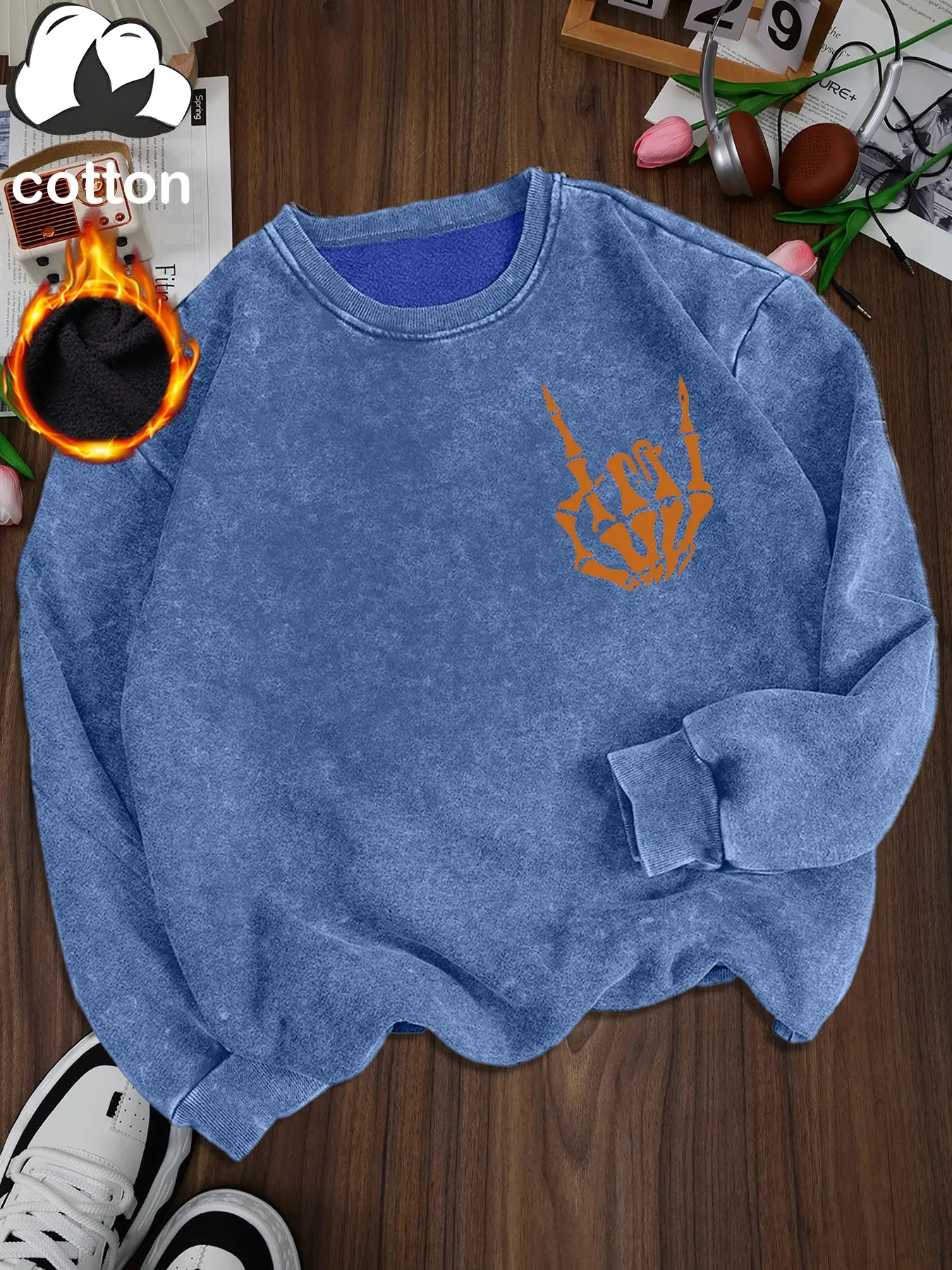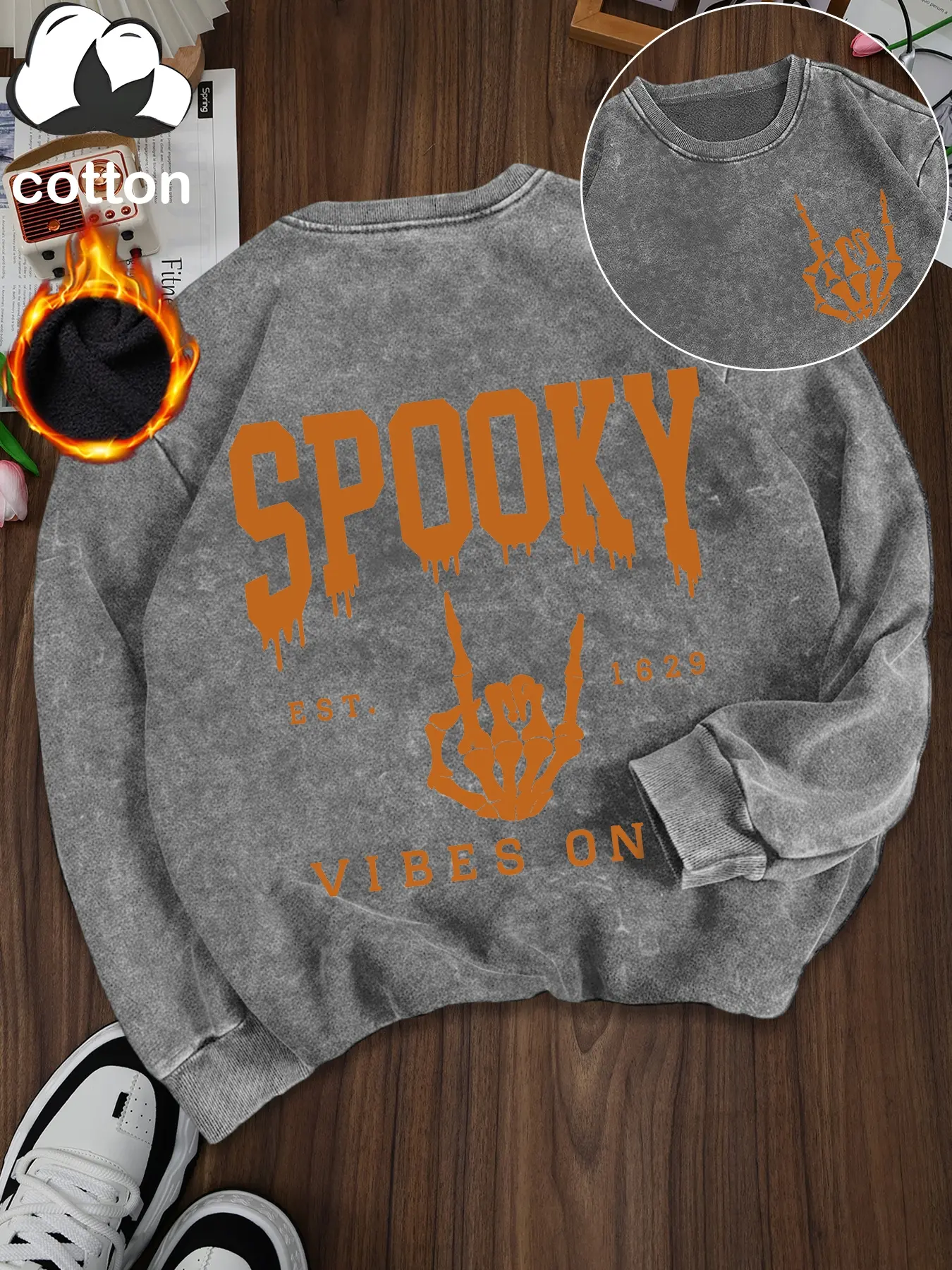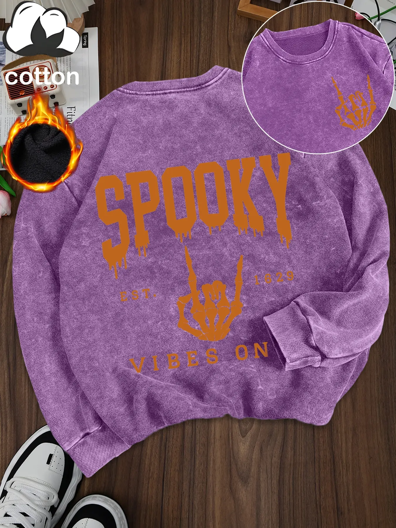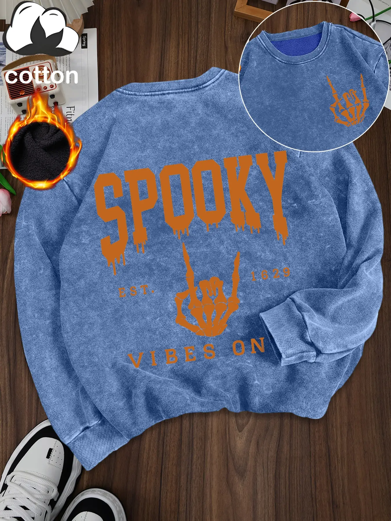 5. Women's Casual Vintage Wash Cotton Pullover Sweatshirt, Round Neck Long Sleeve Fleece Lined Hoodie for Fall Winter Halloween Fashion