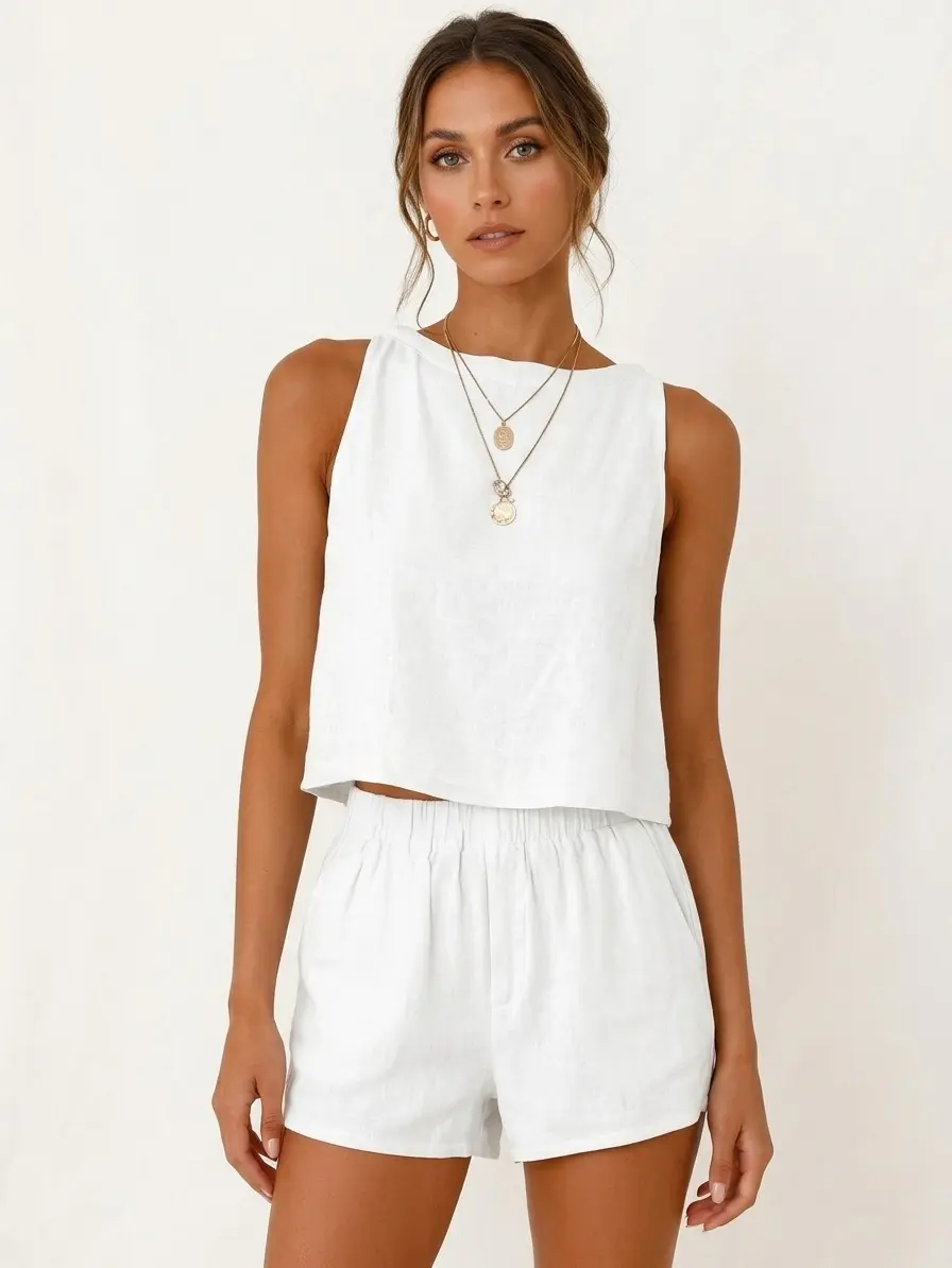 ·Features: Tops(Crewneck, sleeveless, cropped length, button decorative on the back, linen tank tops for women), Shorts(Full elastic waistband, side pockets, above the knee length, linen shorts for women)