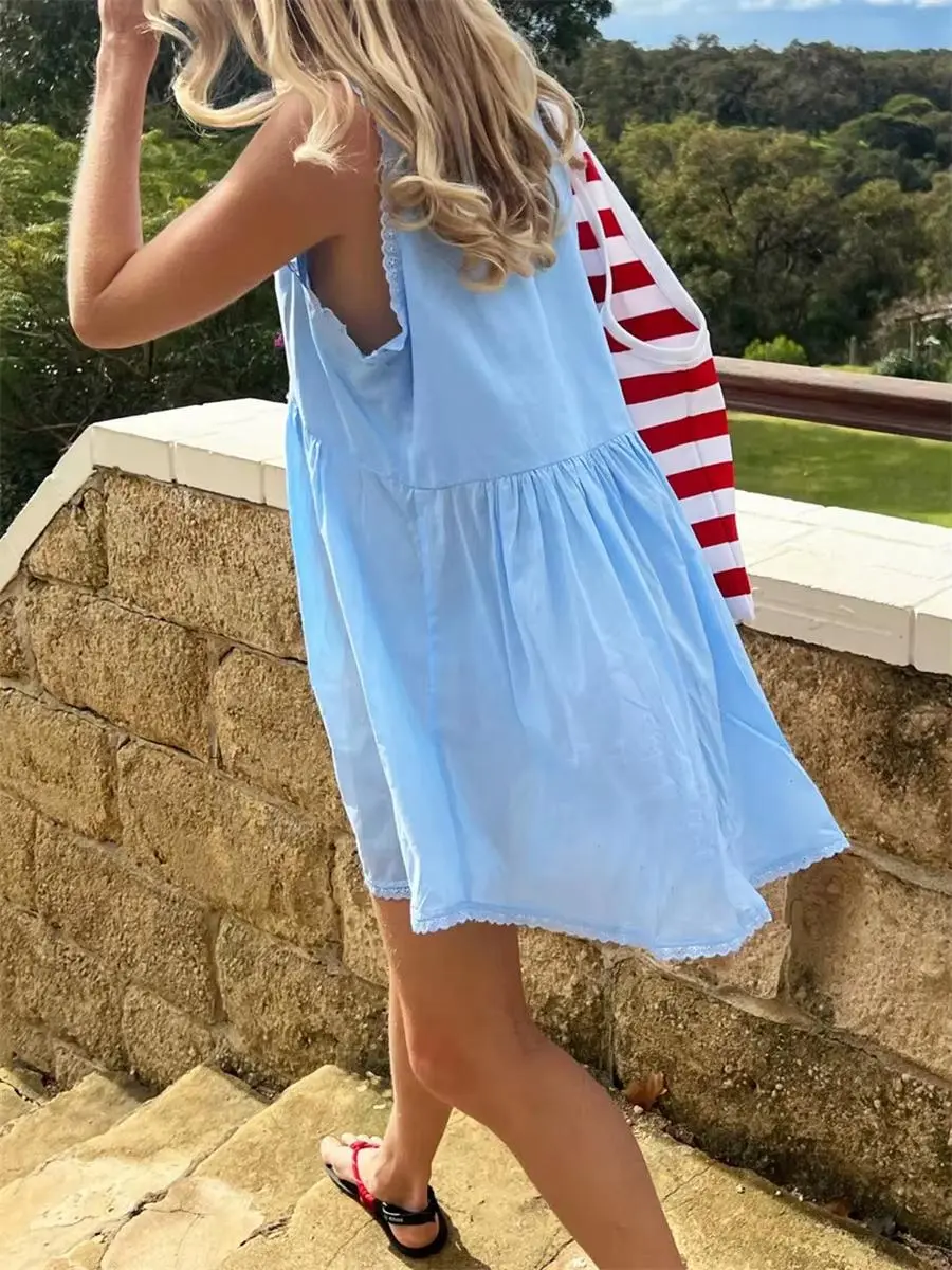 5. Women S Sleeveless Floral Print Mini Dress with Deep V Neckline and Eyelet Detailing - Perfect for Summer Beach Days NONE